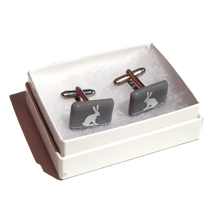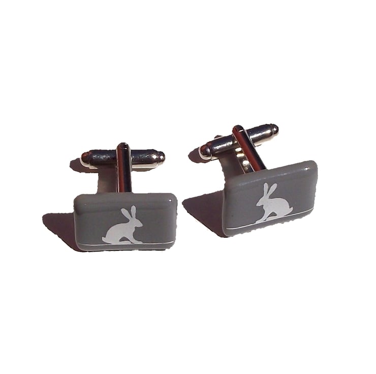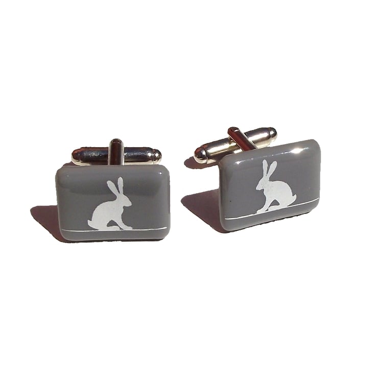 These cufflinks are hand made from coloured opaque glass which is screen-printed with white kiln-fired enamel, with this little hare design. If you would like the hare printed in black glass enamel, this listing can be found in the Cufflink or Hare Collection in my shop.