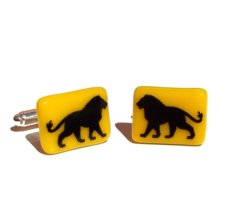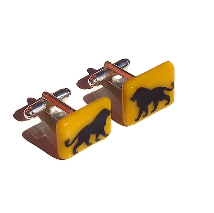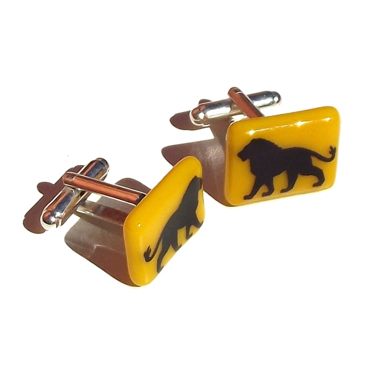 These cufflinks are hand made from coloured opaque glass which is screen-printed with black kiln-fired enamel, with this little lion design.