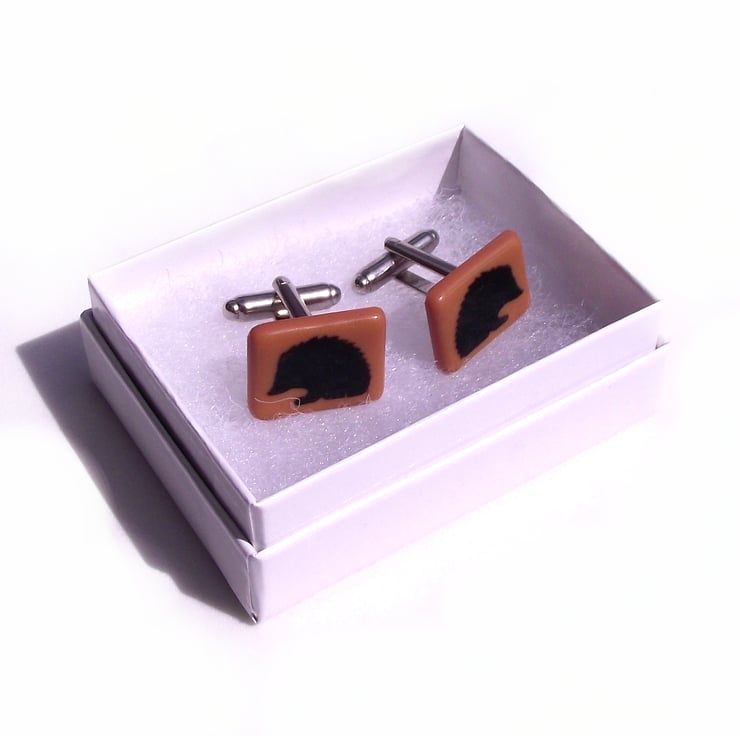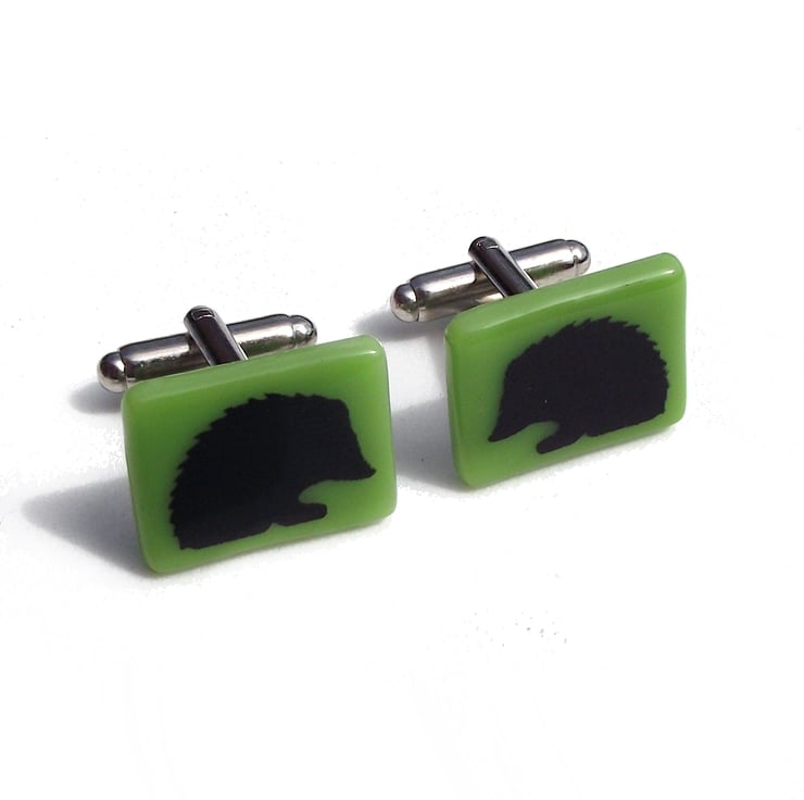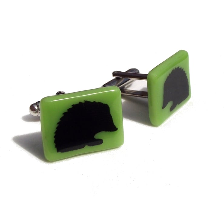 These cufflinks are hand made from coloured opaque glass which is screen-printed with black kiln-fired enamel, with this little hedgehog design.