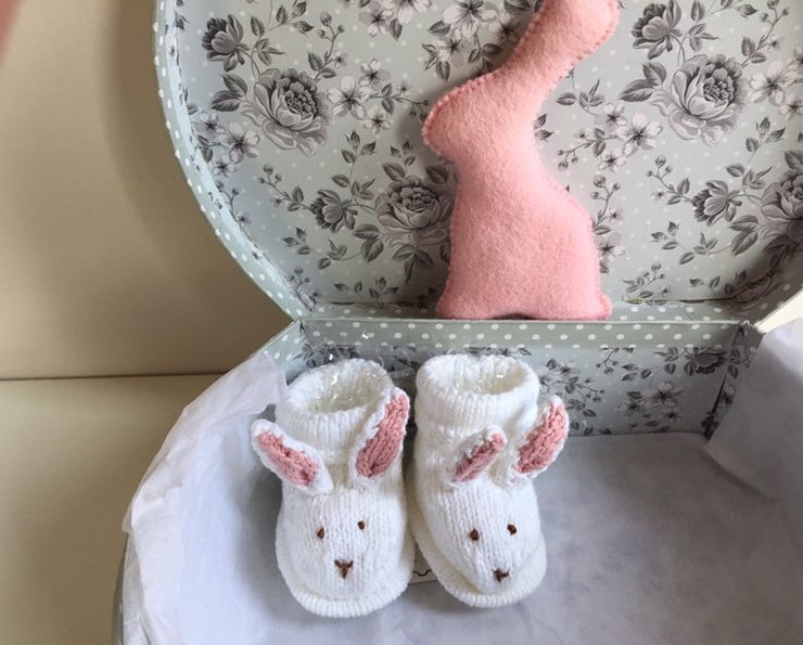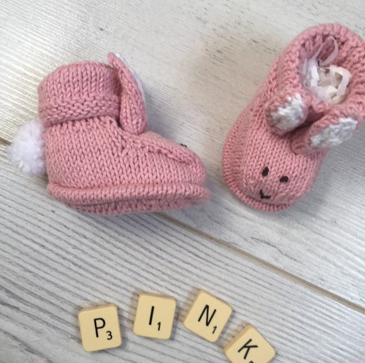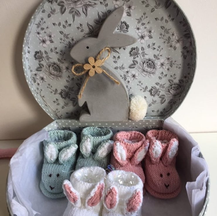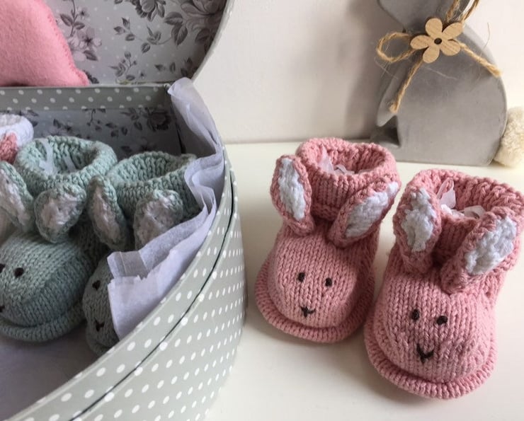 These super cute Bunny baby bootees with their bunny ears and face are hand knitted using Drops 100% cotton yarn, and would make a perfect gift for any new baby .