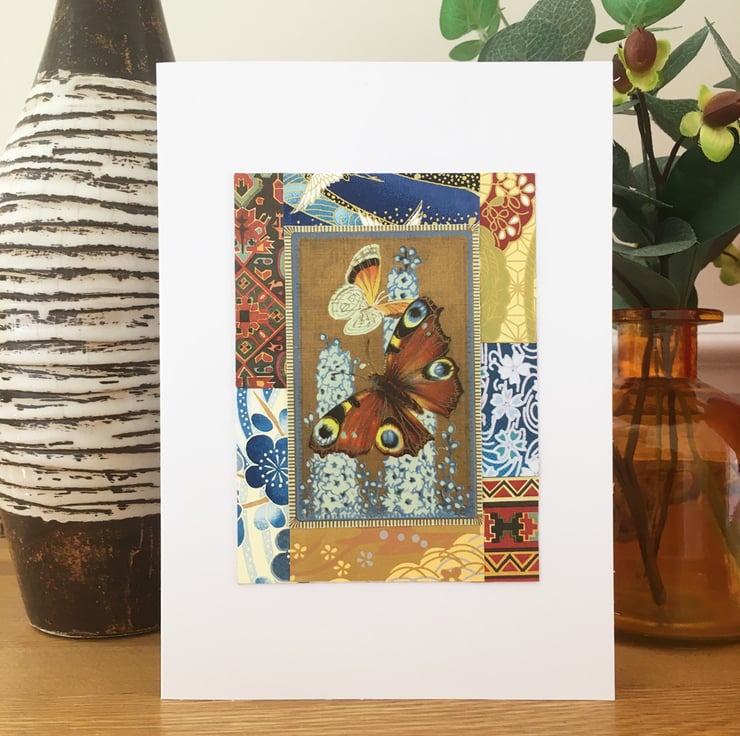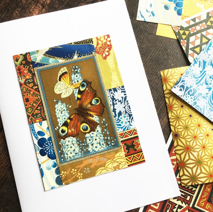 At the centre is a pretty vintage playing card featuring butterflies and flowers. I've used a selection of decorative papers from old books and Japanese origami papers to frame it. There are touches of metallic gold in the origami papers which adds a bit of sparkle.
