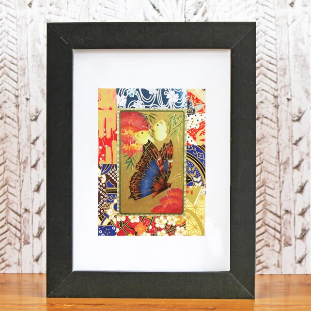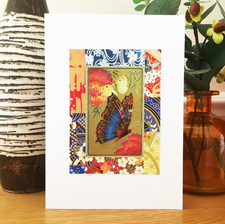 Some time ago I bought a pair of vintage playing cards featuring butterflies and I've used one as the focal point in this little collage. The card can be framed to make an original piece of art and is a lovely way to send a card and gift in one!