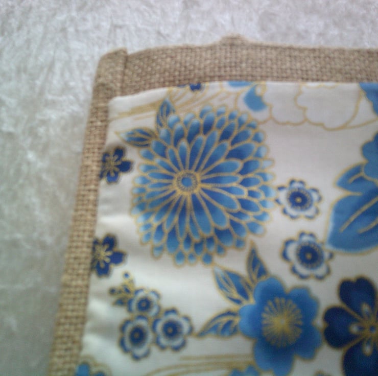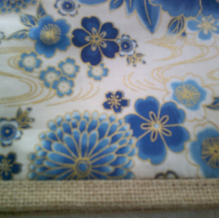 The bag itself measures approximately 22 x 20 x 13 cm (9 x 8 x 5 inches). The fabric pocket - which has been hand sewn onto the bag has a design of flowers in various shade of blue on a cream background.