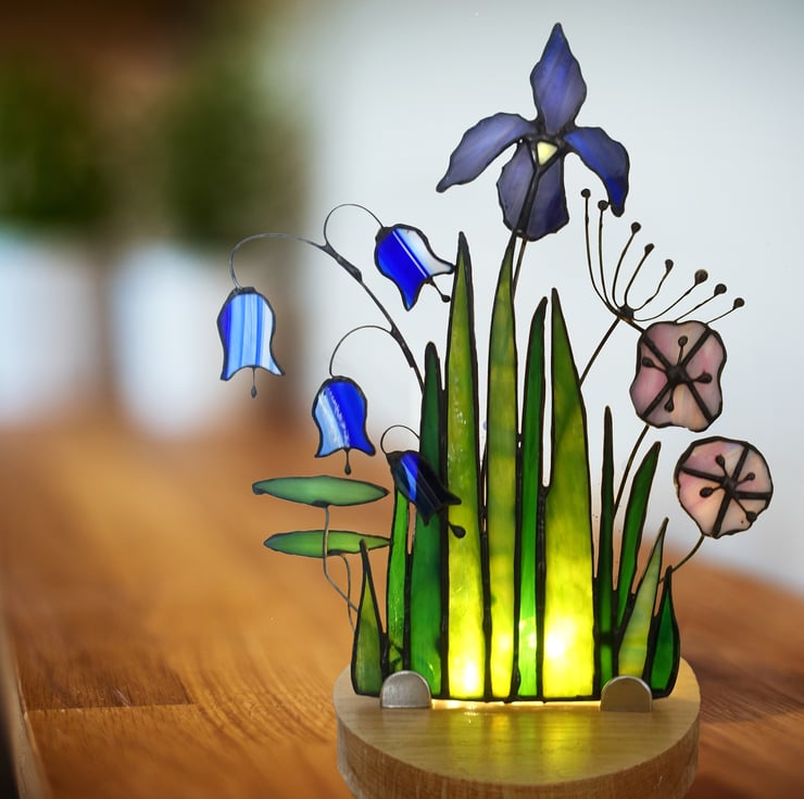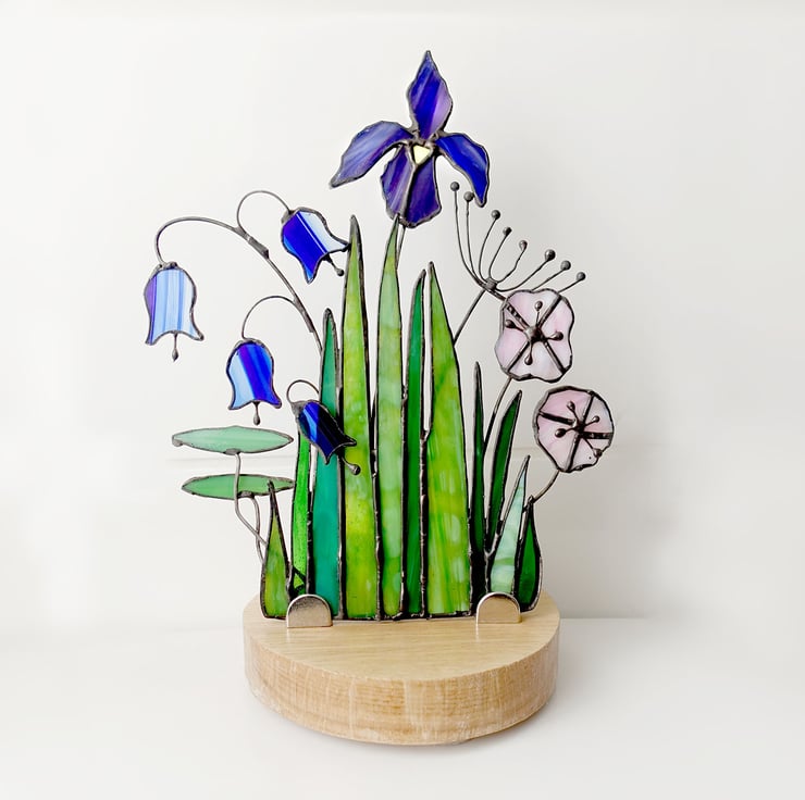 This design has been inspired by marsh flowers, so I've included Iris, Milkwort, lily pads, cow parsley and marsh bells. Each flower has been made from carefully chosen glass to reflect texture and shades, and the grasses are a mix of ring mottle and various shades of green. These truly are, everlasting flowers.