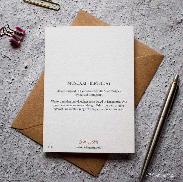 This Muscari flower for this greeting card was originally hand painted in watercolour by us at CottageRts before being printed on to 300gsm card.