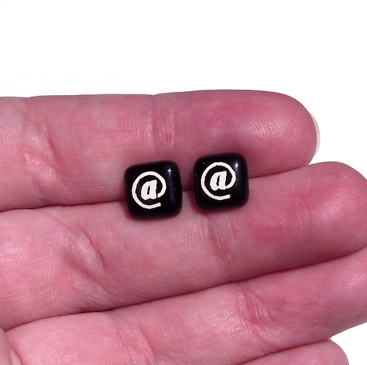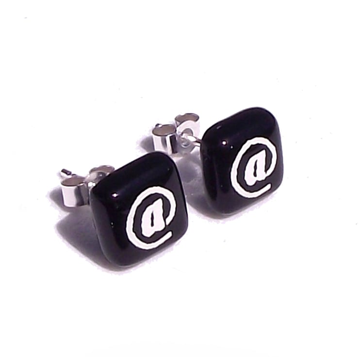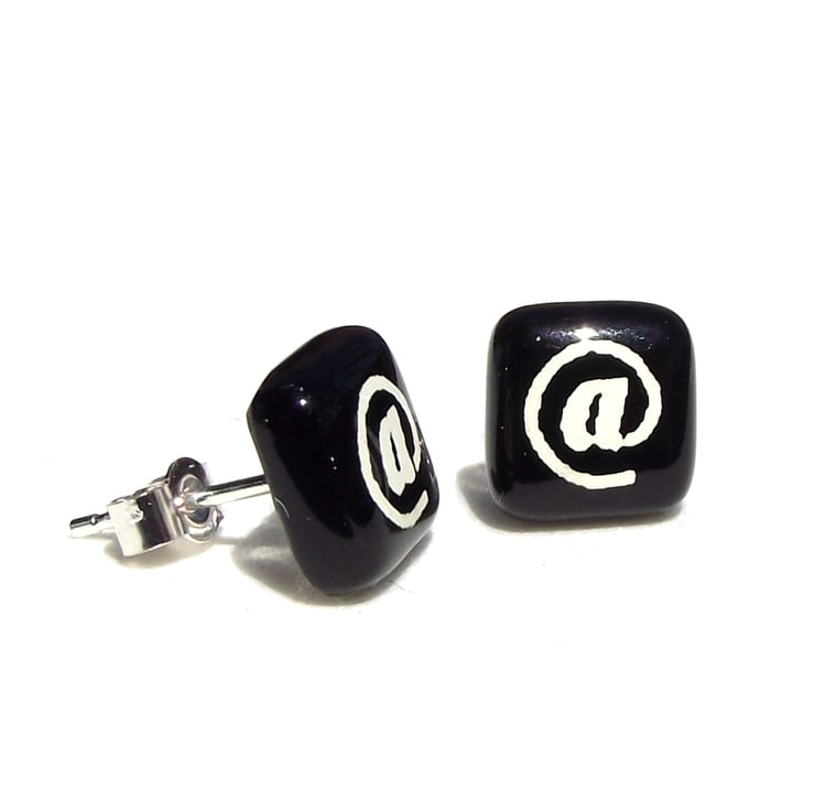These At stud earrings are hand made from bright coloured opaque glass which is screen-printed with kiln-fired enamel, in this At Sign symbol design.