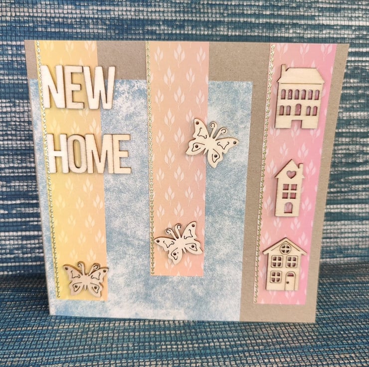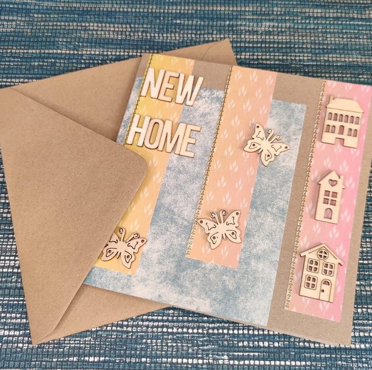 Bespoke individually handmade new home card using the best quality kraft card with a unique design. Using individually selected wooden embellishments to personalise each card. This card comes with a white paper inlay perfect for your own personalised message. All cards come with a unique wax stamp on the back telling you whos designed the card.
