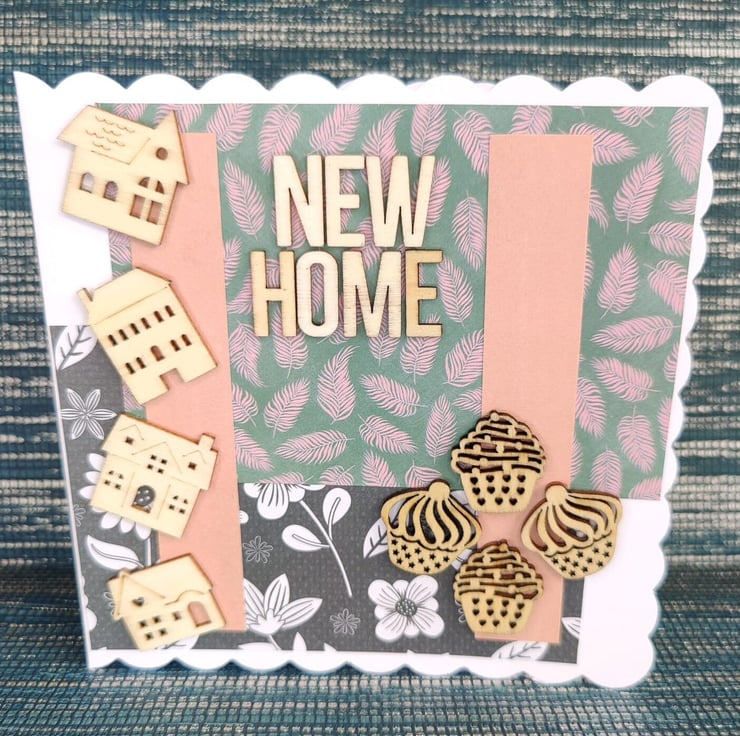 Bespoke individually handmade new home card using the best quality card with a unique design. Using individually selected wooden embellishments to personalise each card. This card comes with a transparent paper inlay perfect for your own personalised message. All cards come with a unique wax stamp on the back telling you whos designed the card.
