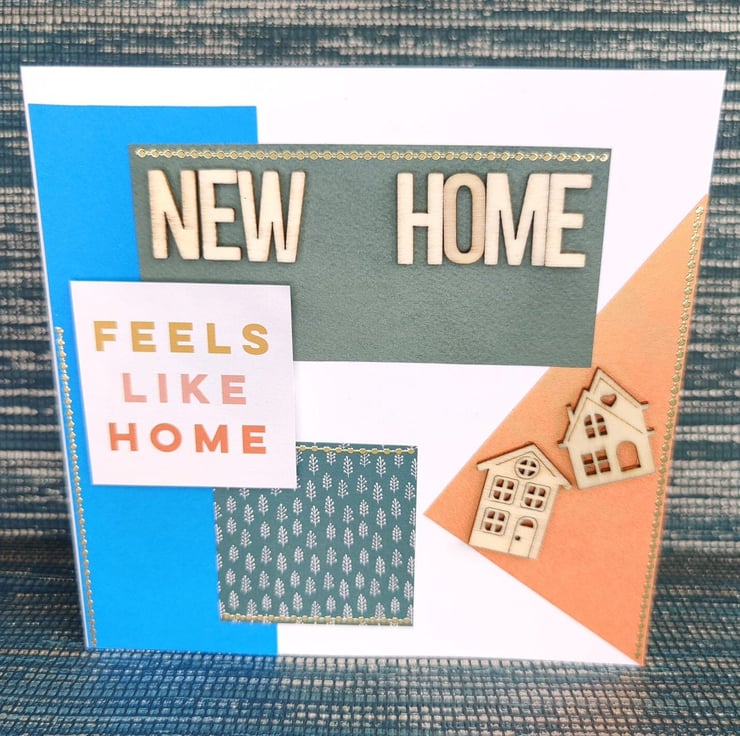 Bespoke individually handmade new home card using the best quality card with a unique design. Using individually selected wooden embellishments to personalise each card. This card comes with a cream parchment inlay perfect for your own personalised message. All cards come with a unique wax stamp on the back telling you whos designed the card.