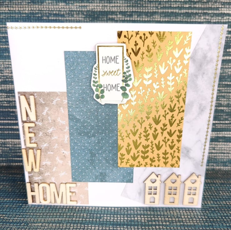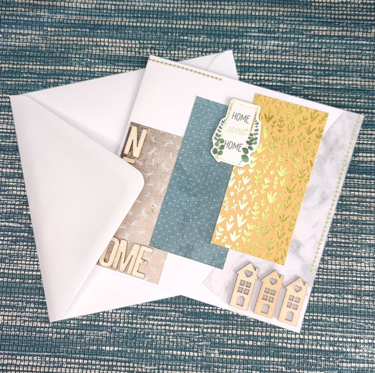 Bespoke individually handmade new home card using the best quality card with a unique design. Using individually selected wooden embellishments to personalise each card. This card comes with a cream parchment inlay perfect for your own personalised message. All cards come with a unique wax stamp on the back telling you whos designed the card.