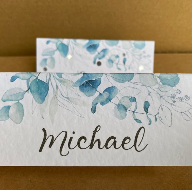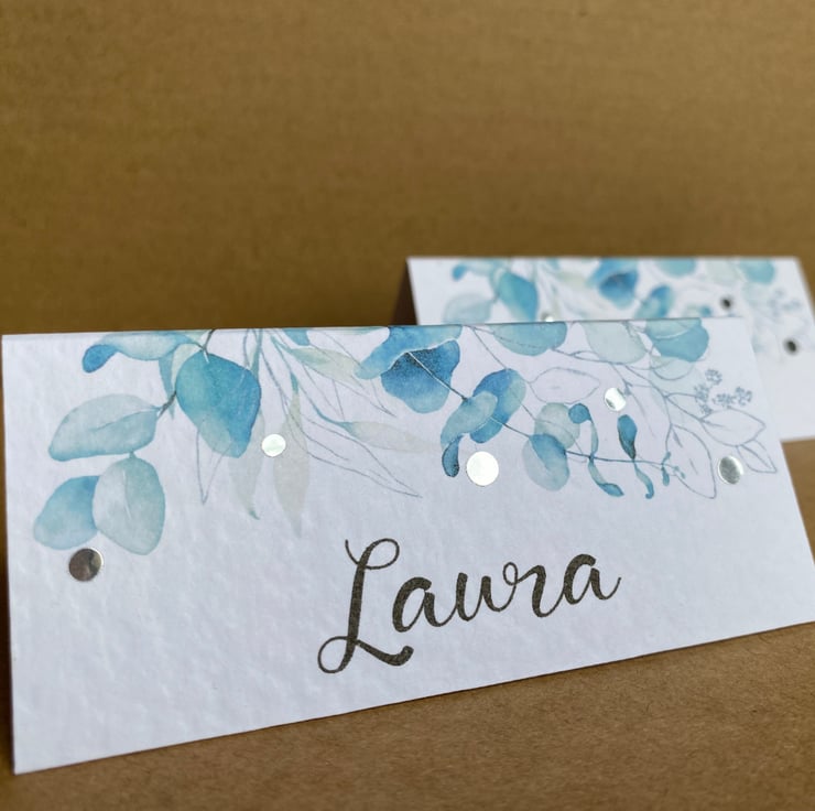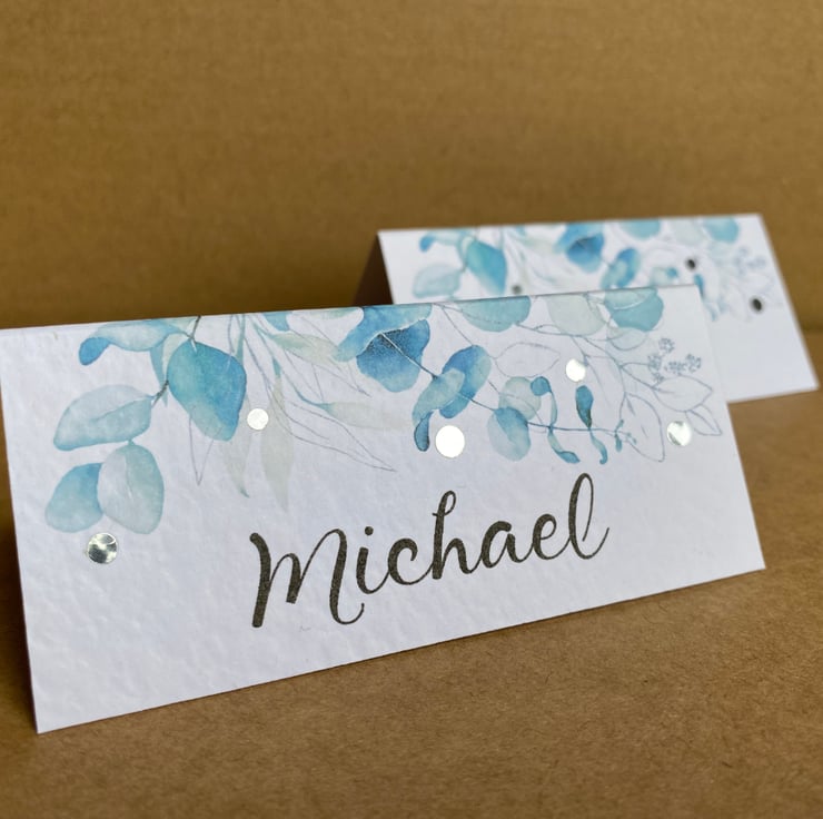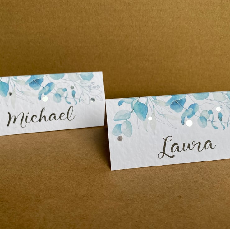 Calligraphy style font, blue eucalyptus leaves, greenery edge design with or without metallic silver dots.