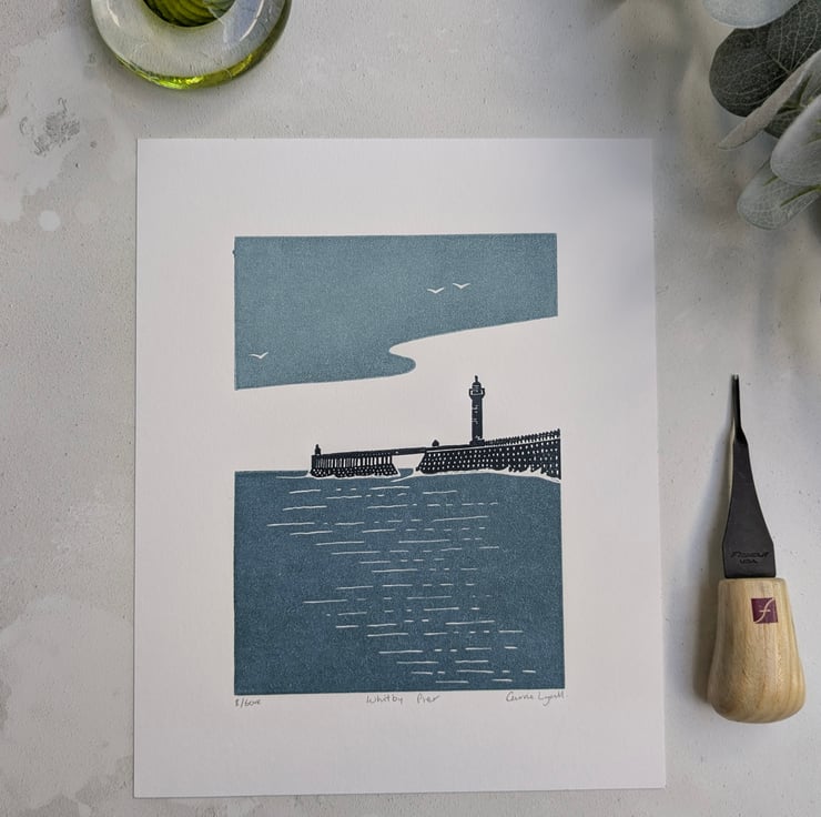 Whitby Pier Print, North Yorkshire Coast Linocut Print, Limited Edition