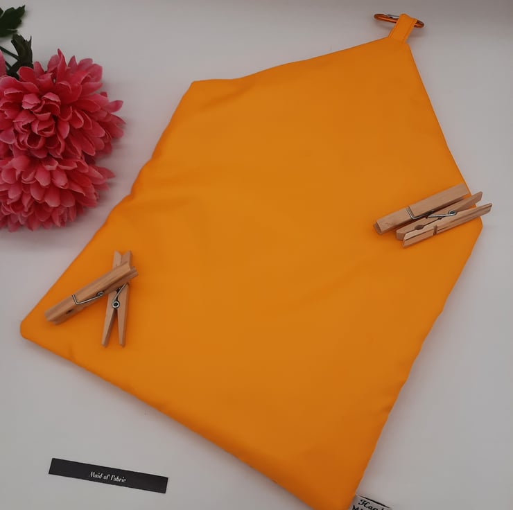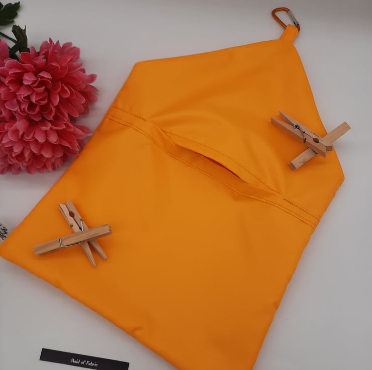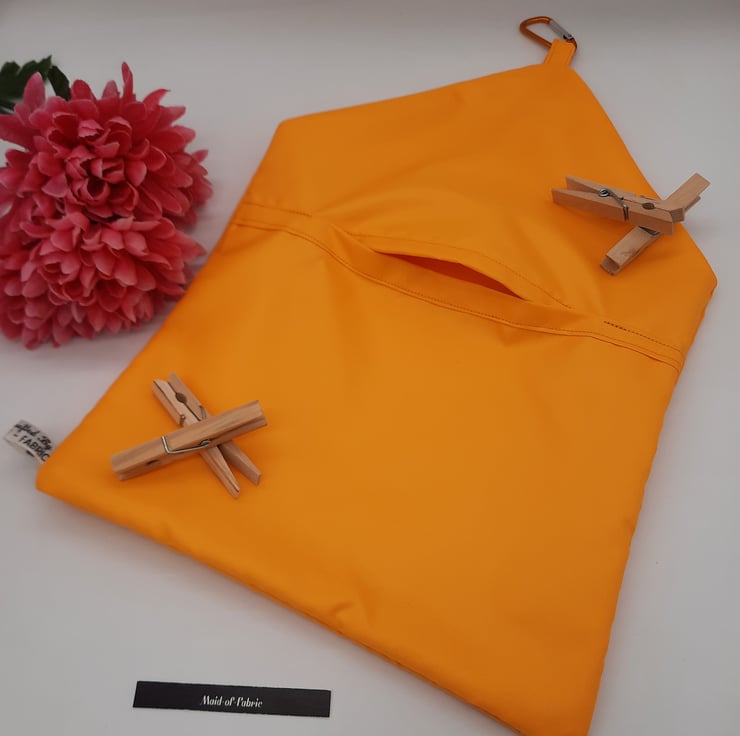 It has a Yellow carabiner clip so it can be attached to the washing line and won't blow off in the wind.