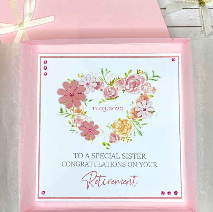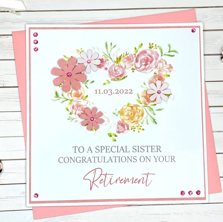 A handmade retirement card with a watercolour floral heart design. Finished with rhinestones, flowers and a heart, this card can be personalised with the retirement date and would be ideal for any female friend, relative or colleague.