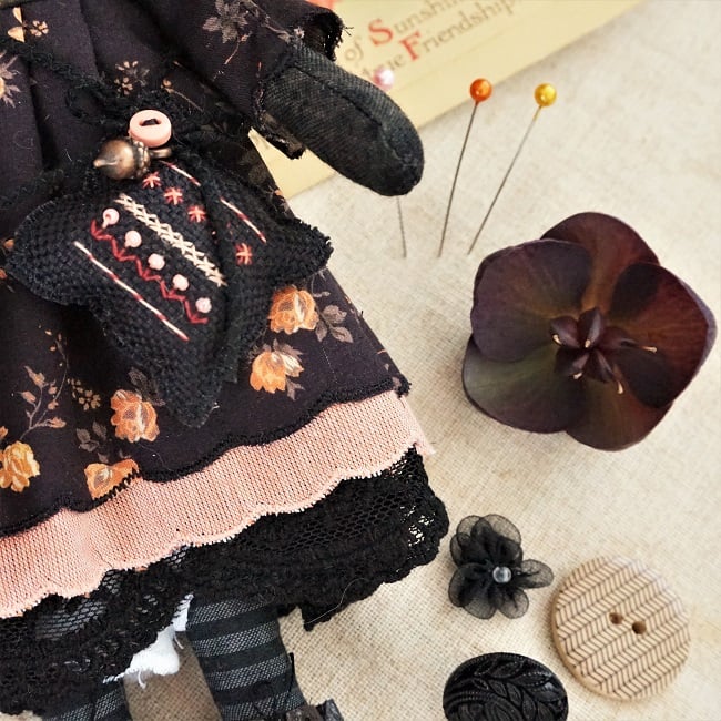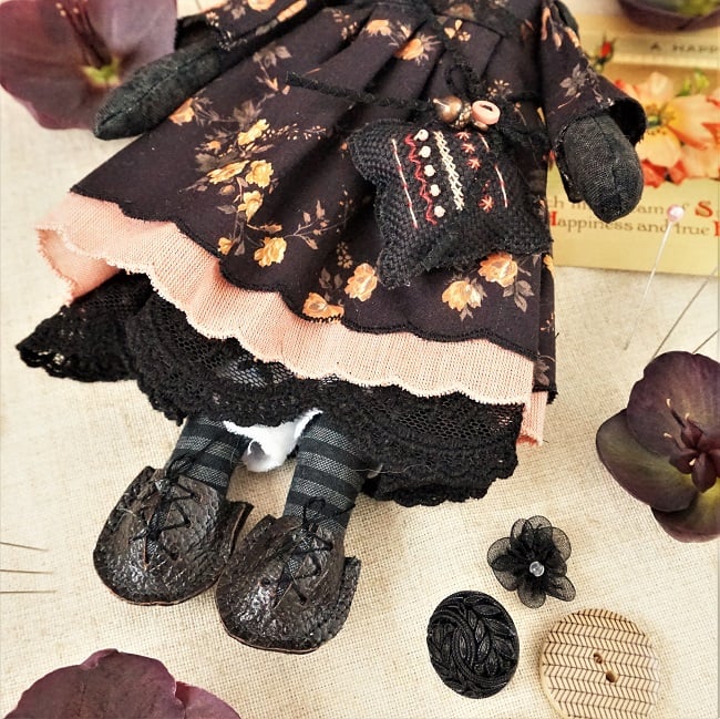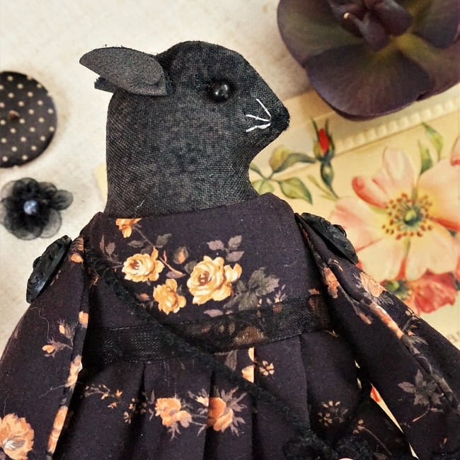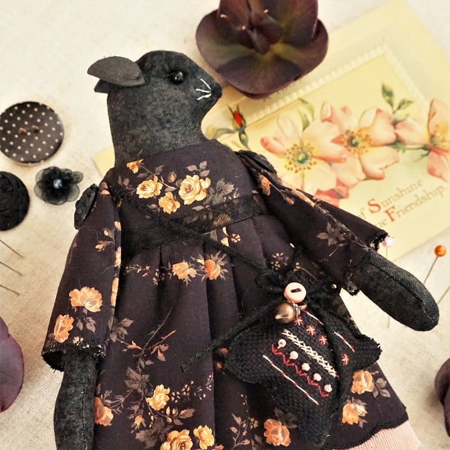 This is Rosaria, a tiny midnight mouse. She is a hand embroidered mouse with little leather ears and tail. She is dressed in a Liberty tana lawn cotton called Elizabeth the midnight version in black with orange and peach roses. She has coordinating underskirts in black tulle mesh and white cotton lace bloomers. Her dress is finished with organza ribbon, tiny buttons and little leather shoes. She is a black mouse with black ears and tail, grey wishkers and an embroidered black nose.