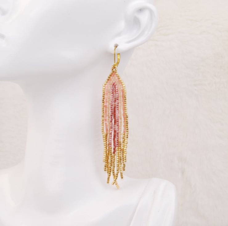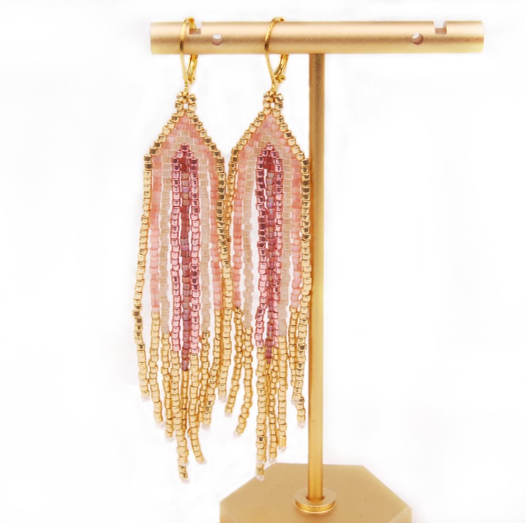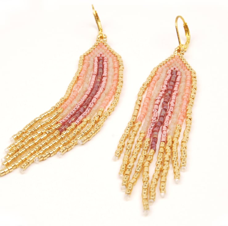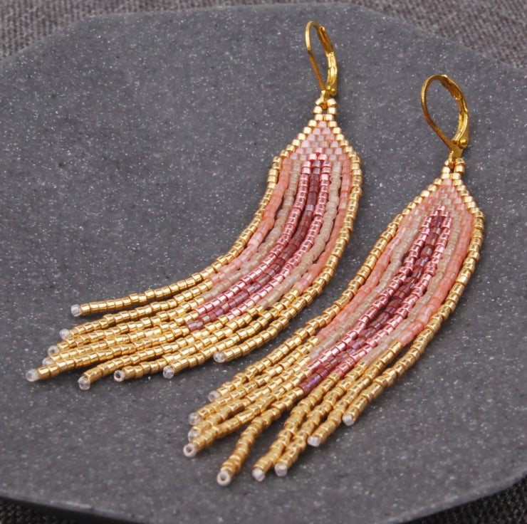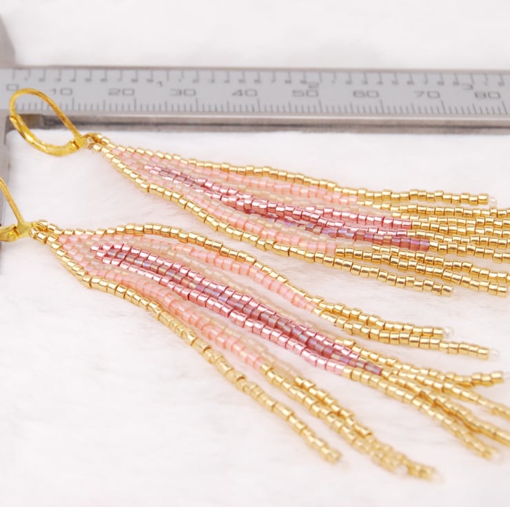 Hand woven with tiny delica beads, these statement fringe earrings are an elegant addition to your jewellery collection. In gold with shades of pink the beads shimmer beautifully in the light with each sway and movement. The earrings are around 3 1/4 inches long with gold plated lever back ear hooks which add another 1/2 inch.
