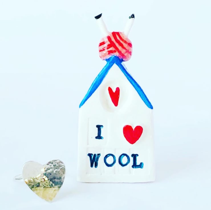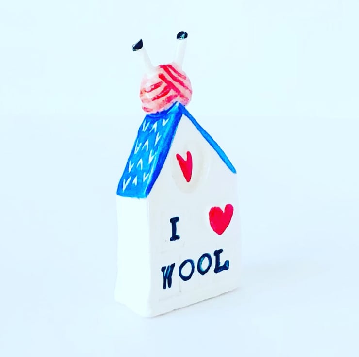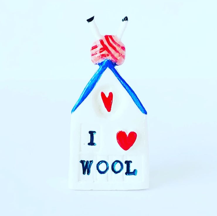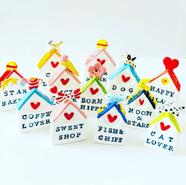 This little house has been lovingly handmade from porcelain clay. Designs such as a heart are pressed into the clay by a homemade stamp. Each house has its own theme and corresponding words. They are hand decorated with colourful underglazes and then fired in the kiln twice - the second firing adds the glossy transparent glaze. They look lovely on a shelf or windowsill and make great gifts! Measurements: 6cm high by 3cm wide.
