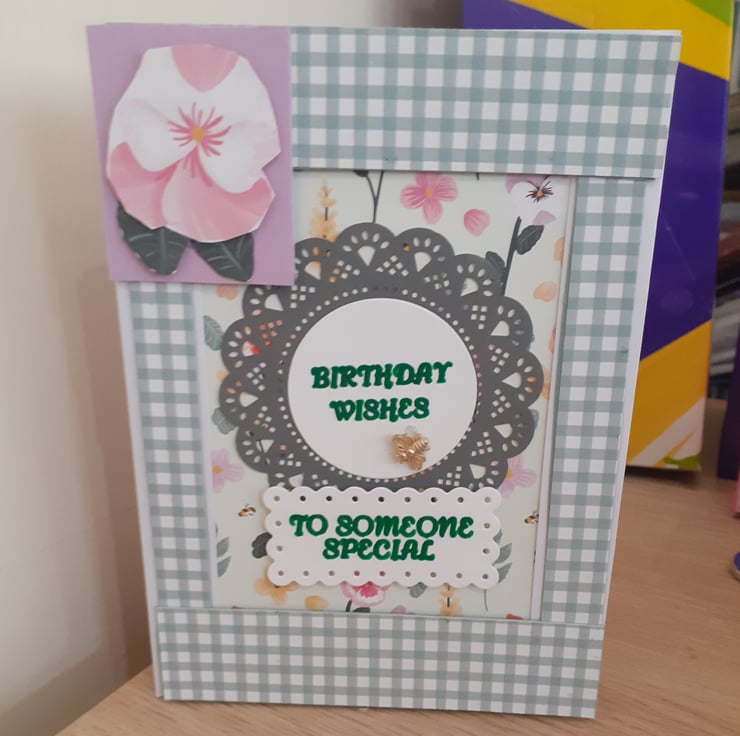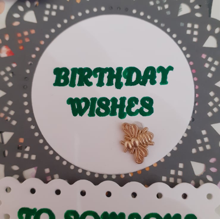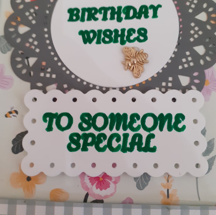 The greeting on the front of this card reads "BIRTHDAY WISHES" "TO SOMEONE SPECIAL" All of the greeting is inked in green. The green ink compliments the card boarder and the leafs of the flowers. "BIRTHDAY WISHES" is inked on to a circular white background and placed inside a grey Stampin Up fine detailed dolly. On the white circle is a golden Stampin Up gem bee The greeting "TO SOMEONE SPECIAL" is inked on to a detaileed Stampin Up rectangular piece of white card. Images of the detailed elements can be seen in my photos. If you have any questions or require more photos please let me know.