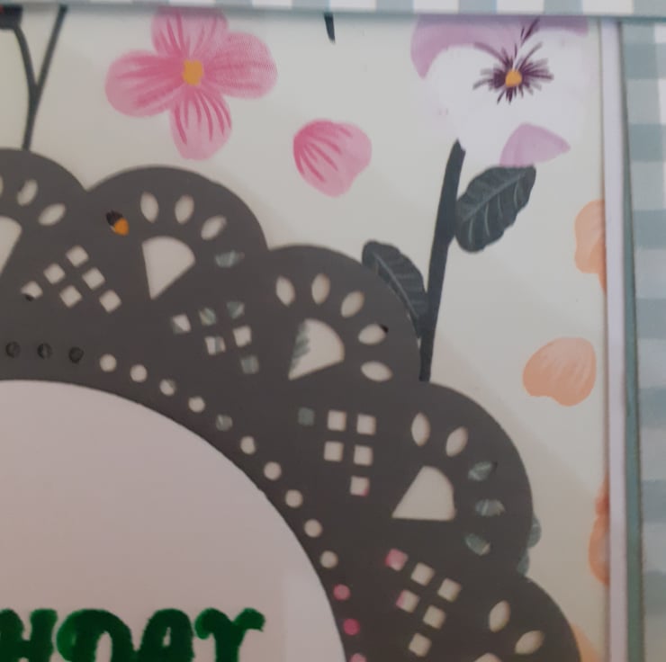To create this beautiful card I have placed a flowered background into the center of the main card and surrounded it with a green and white checked border. The border has a thin white border along the sides of the topper, this enriches the 3d dimensions of this beautiful card.