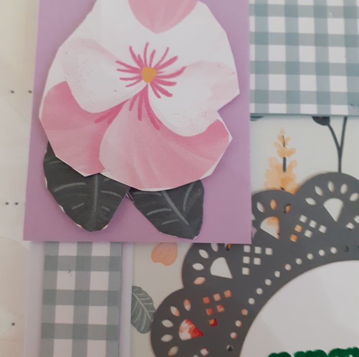 On the top left hand side of the card is a pink hand-cut flower that matches the original backing paper. The hand-cut is placed on a lilac rectangular piece of Stampin Up card and placed on to the card topper using foam sticky pads. This flower gives extra detail and dimension to the card.