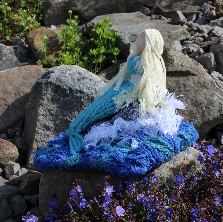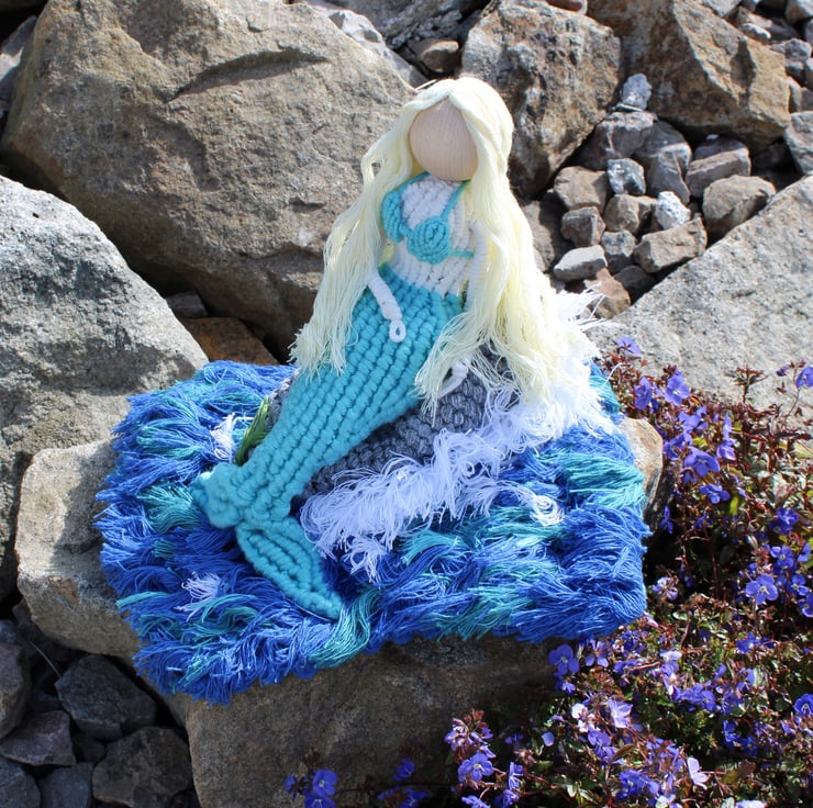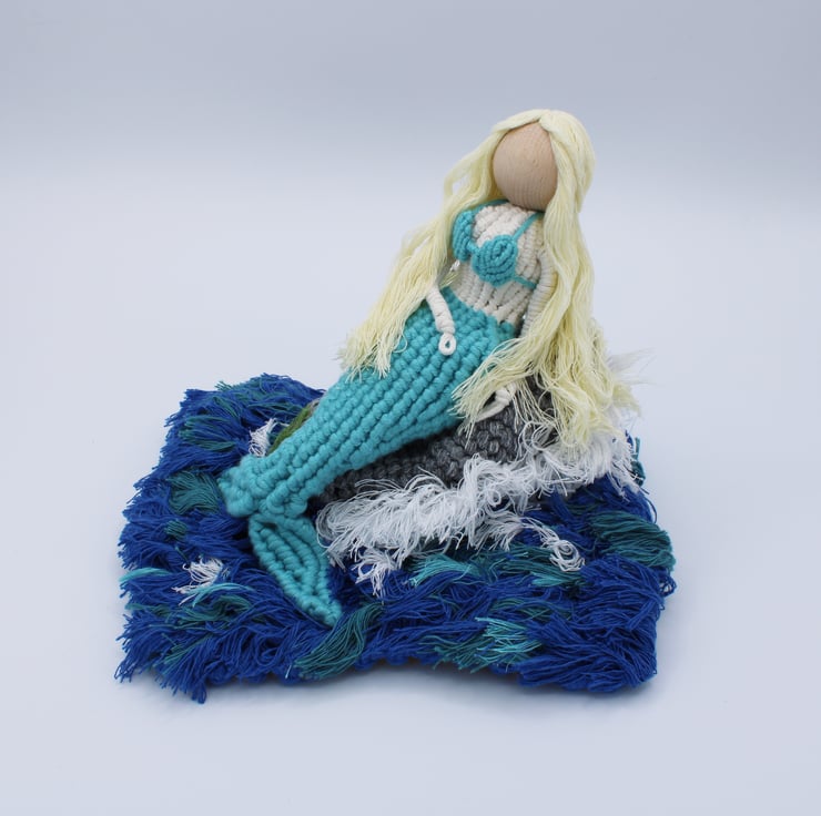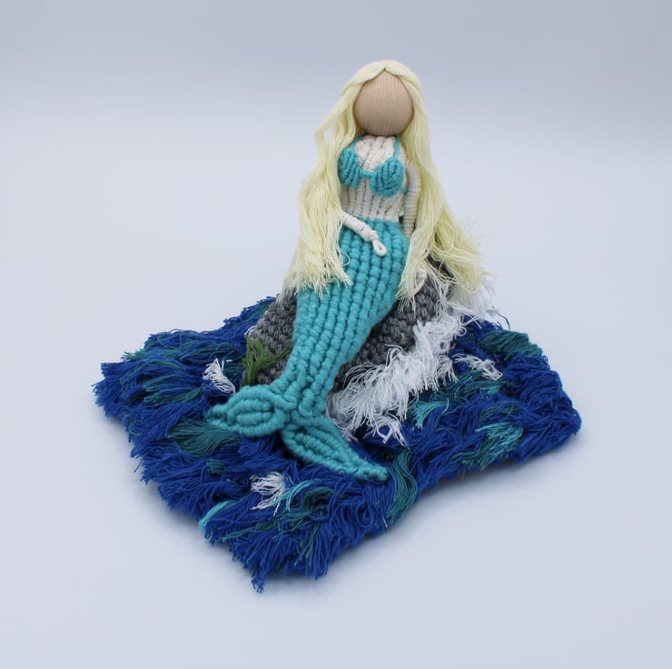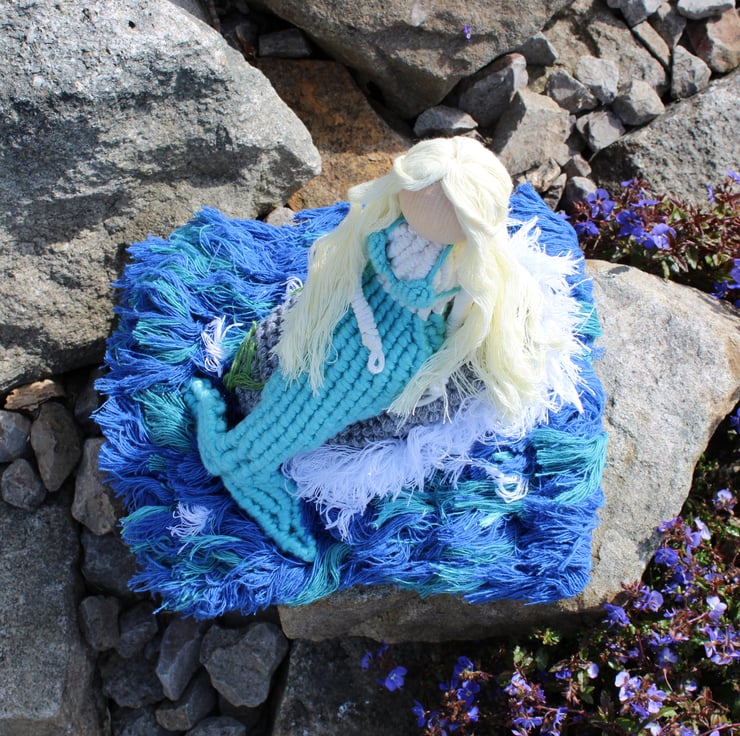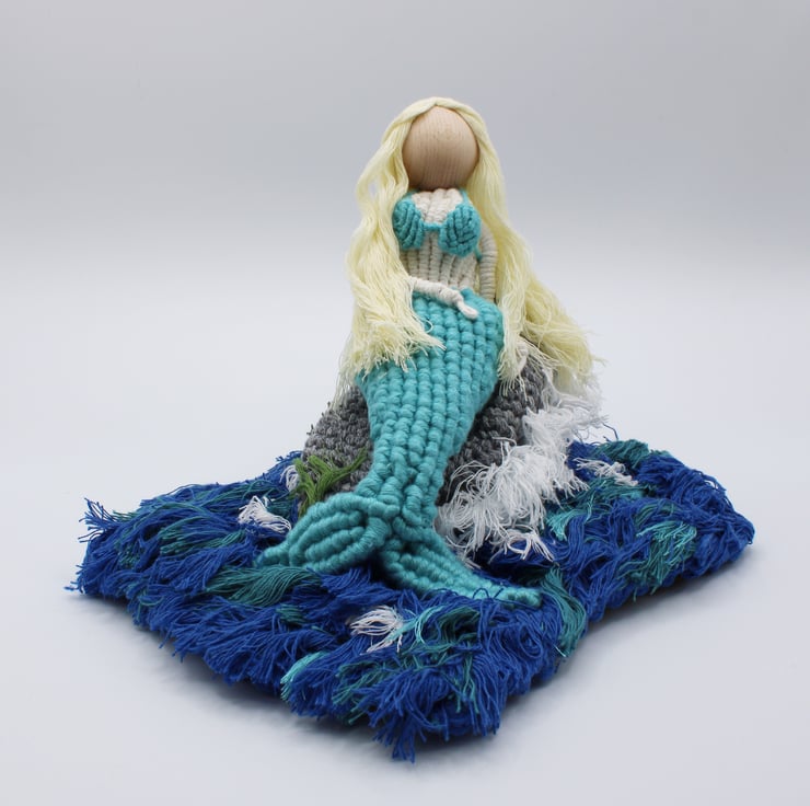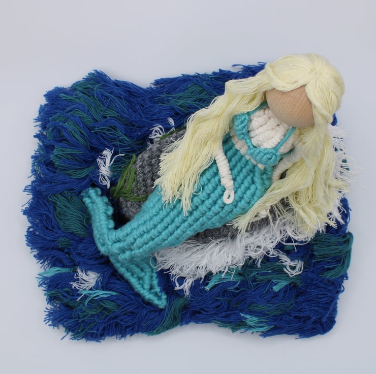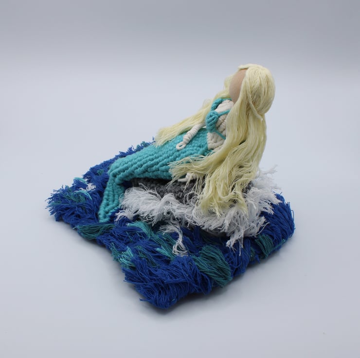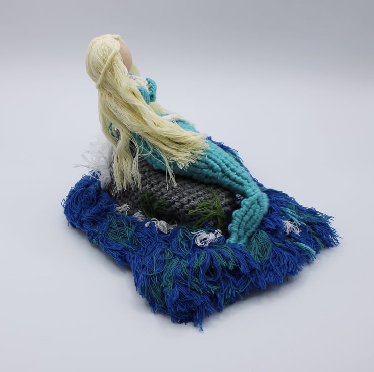 Unique macramé sculpture of a mermaid resting on a rock in the ocean whilst the waves crash around her.