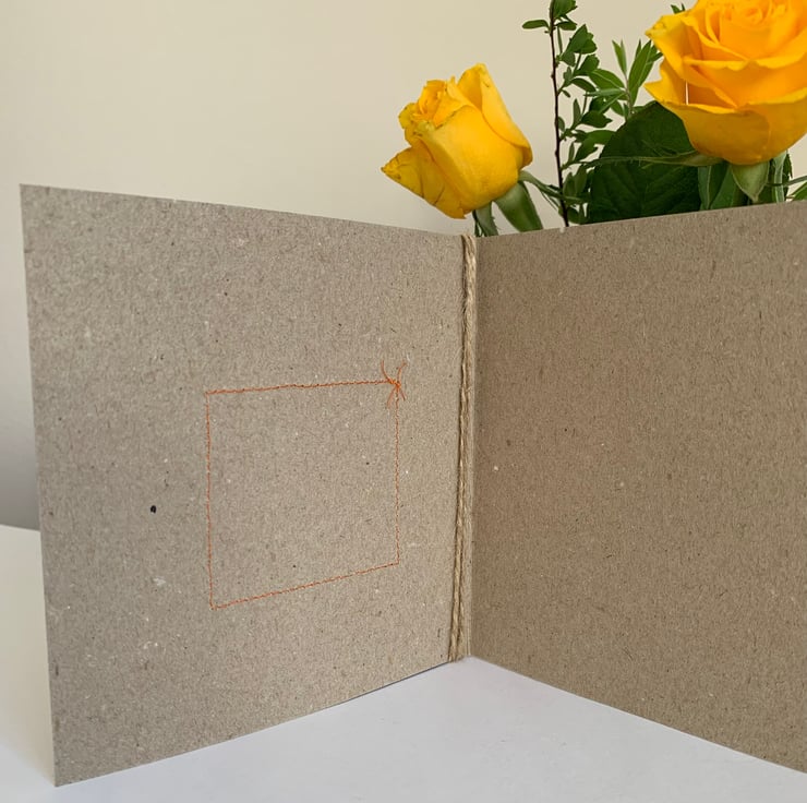 The hessian is machine stitched, using a contrasting thread, onto a plain brown recycled card. This stitching is visible on the inside of the card.