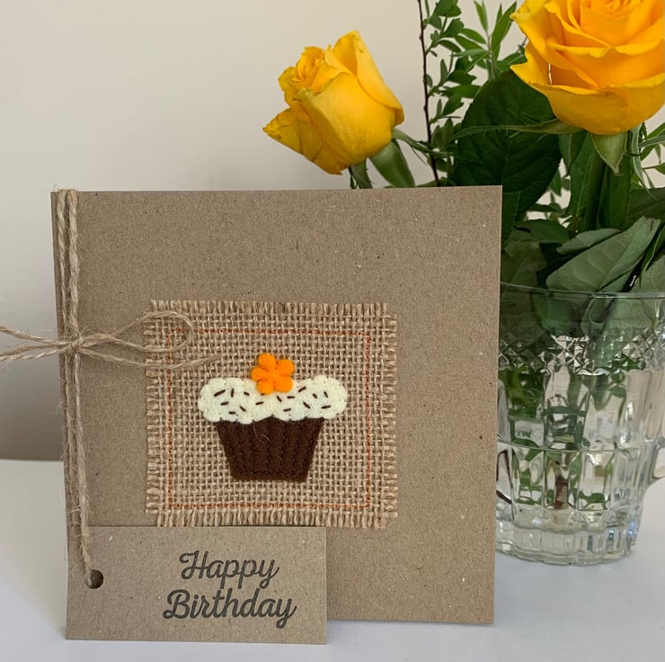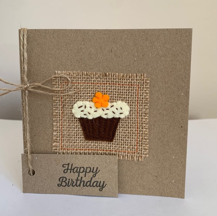 This card is decorated with a chocolate cupcake topped with an orange flower. The decoration is hand cut from 100% wool felt. It is then sewn by hand and machine onto a hessian background.