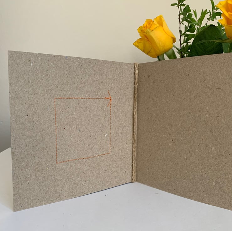 The hessian is machine stitched, using a contrasting thread, onto a plain brown recycled card. This stitching is visible on the inside of the card.
