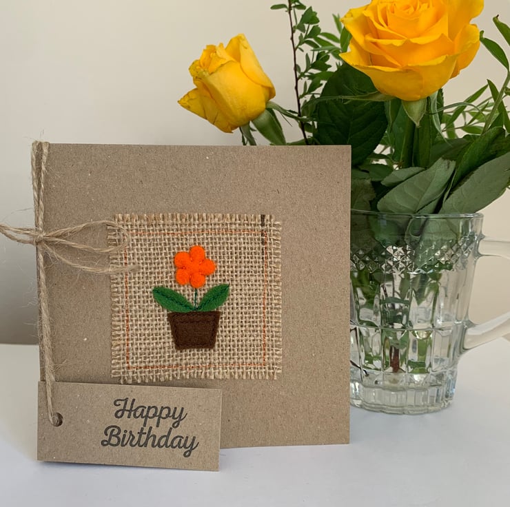 This card is decorated with a bright orange flower in a dark brown pot. The decoration is hand cut from 100% wool felt. It is then sewn by hand and machine onto a hessian background.