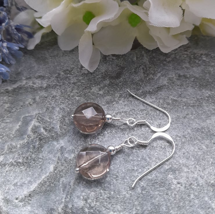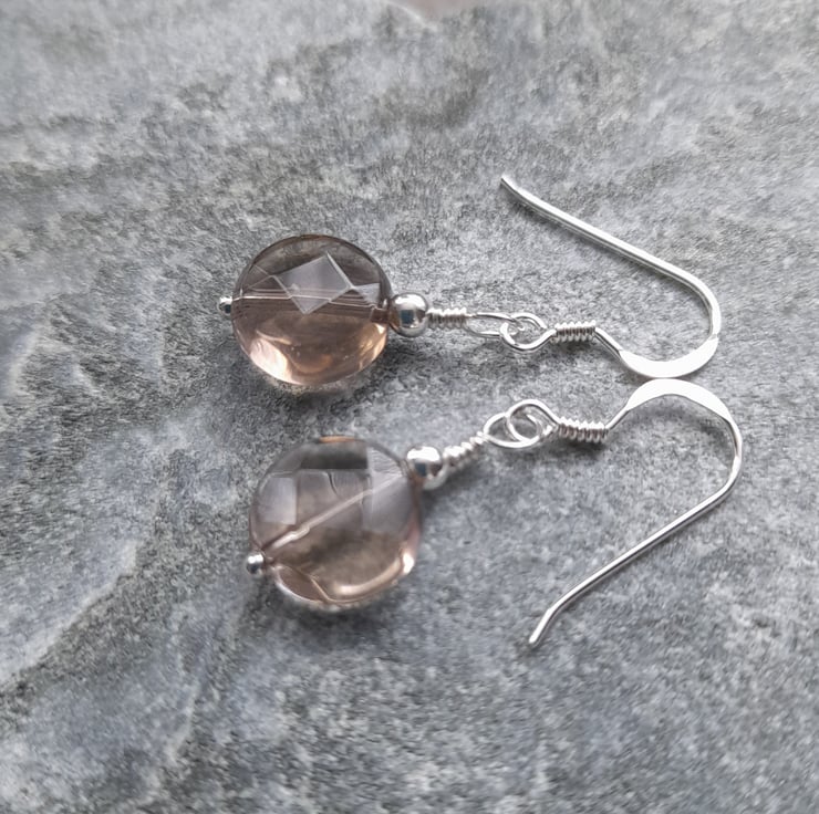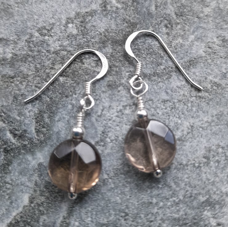 Smokey quartz faceted round disc shaped semi precious gemstones are attached to sterling silver ear wires