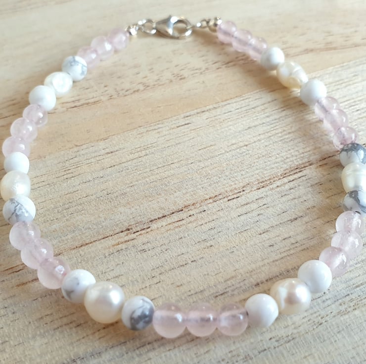 This semi-precious stone bracelet features Rose quartz, howelite, pearls and is secured using a sterling silver clasp. It measures approximately 7.5 inches in length but I can add a extender chain if required, please let me know when placing your order.