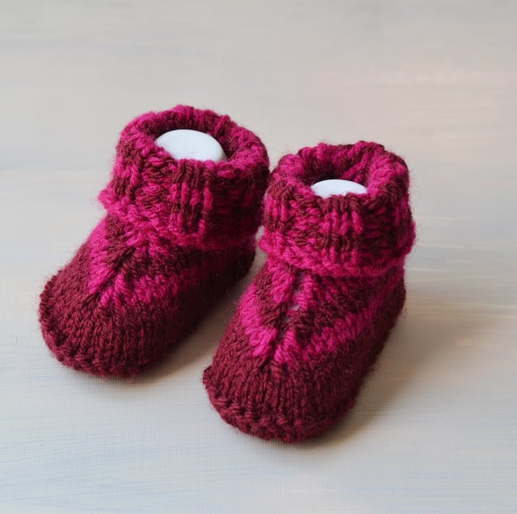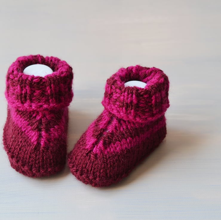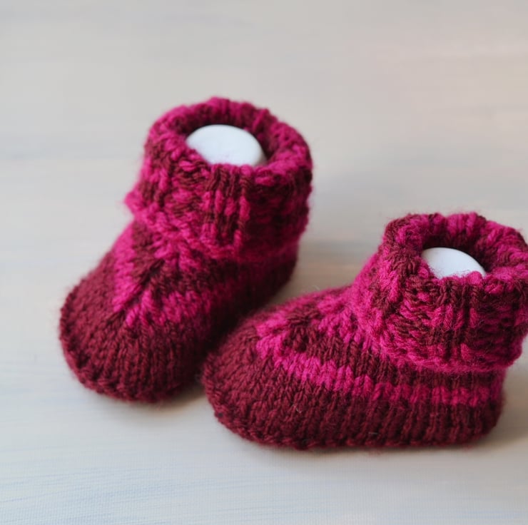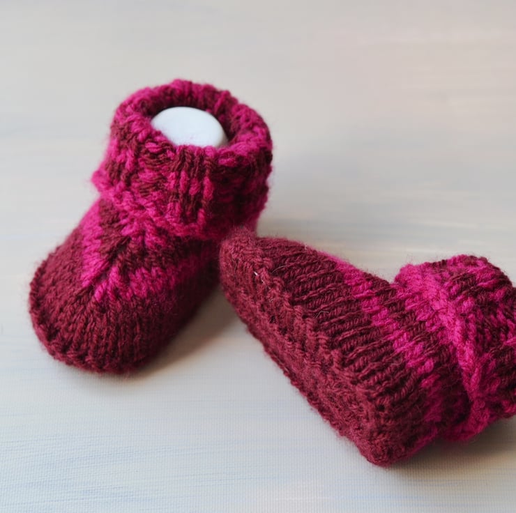 New design. Girls knitted newborn baby booties. Made in 100% acrylic in burgundy with fuschia stripes. I will be adding lots more over the next few weeks.