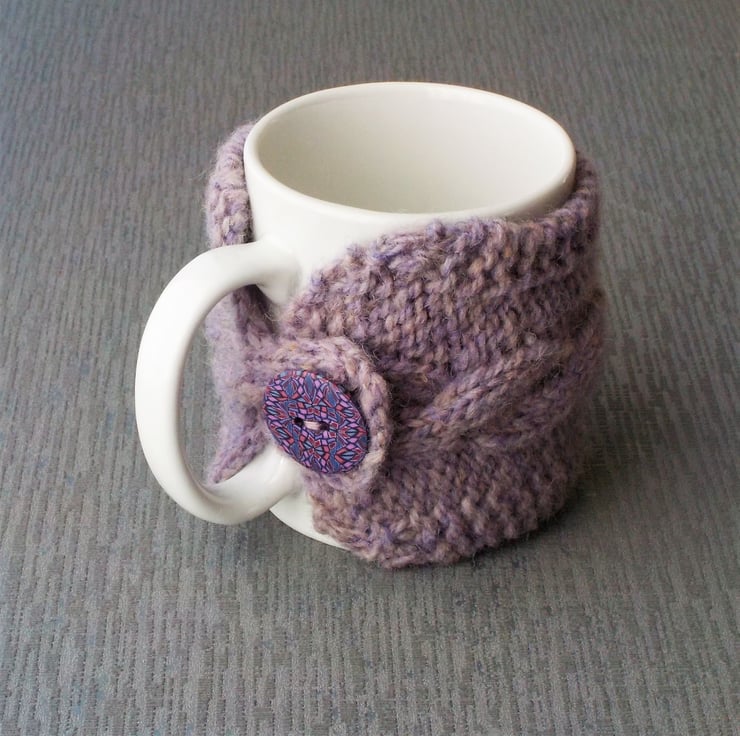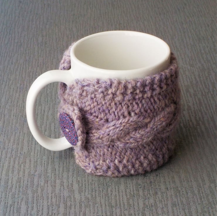 Here is a lovely gift for those who use a mug rather than a teacup. A mug cosy totally handmade here in the UK. The gorgeous pure British wool is a soft Blue-faced Leicester wool in a mottled lilac. I have used it to knit a cable design mug cosy. The cosy fastens through the handle of your mug with a handmade patterned button, made by another British crafter.