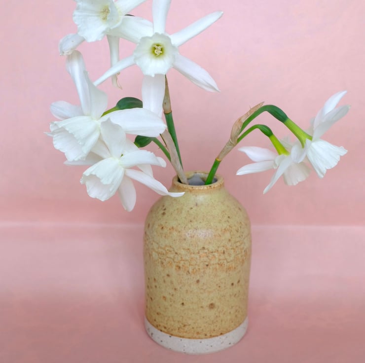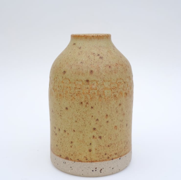 Hand thrown vase in flecked stoneware, glazed with a mustard coloured matt glaze. Carvings on the shoulder.