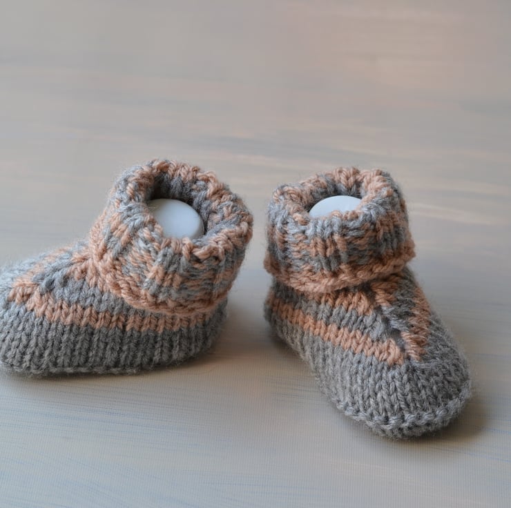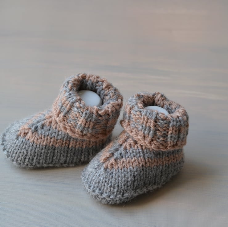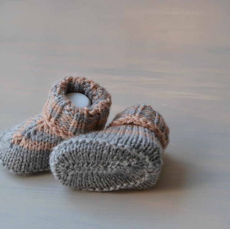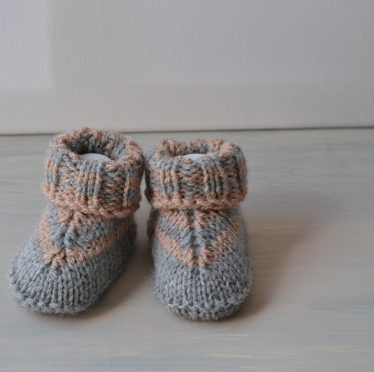 New design. Unisex knitted newborn baby booties. Made in 100% acrylic in a mid grey with light beige stripes. I will be adding lots more over the next few weeks.