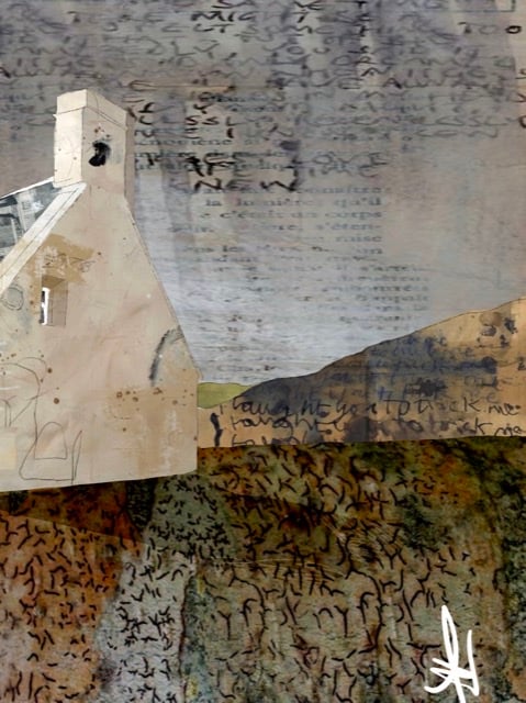 Beautiful evening colours come together to create an atmospheric artworkl. The main body of work is from close up images of trees and script collage then digitally painted over to create cohesion.