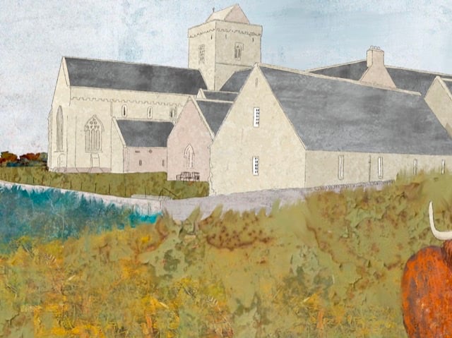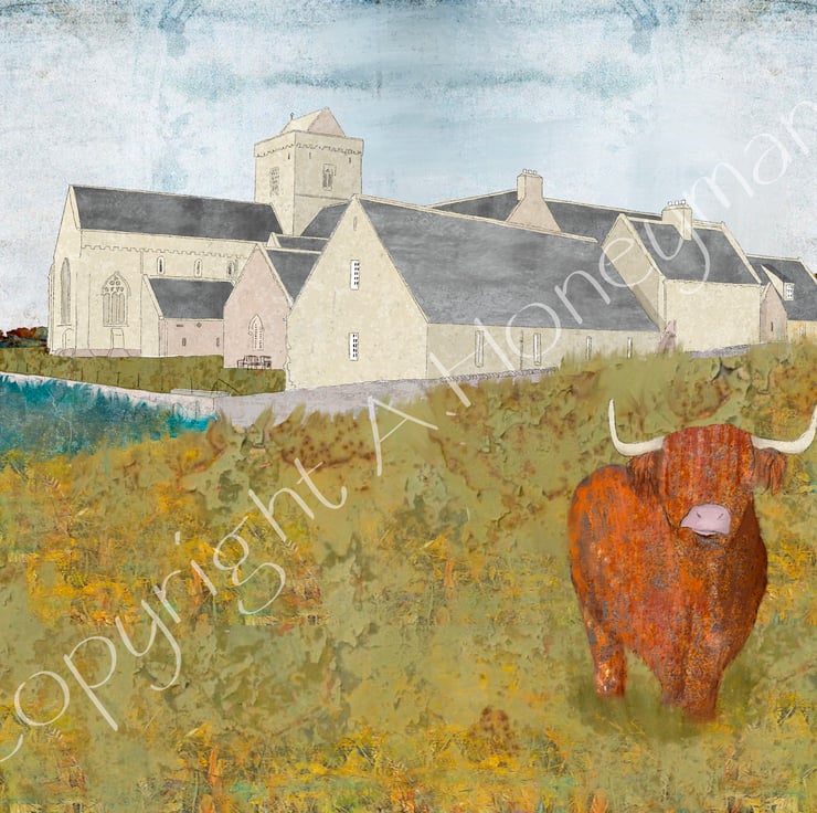 Beautiful Scottish landscape colours come together to create a beautiful artwork of Iona Abbey on the the island of Iona, just off the Isle of Mull on the West Coast of Scotland. It is one of the oldest Christian religious centres in Western Europe.