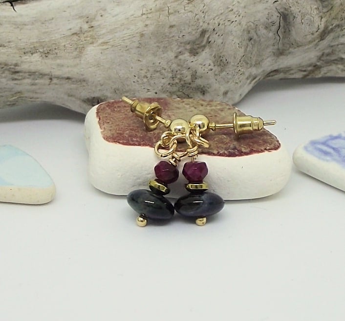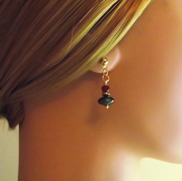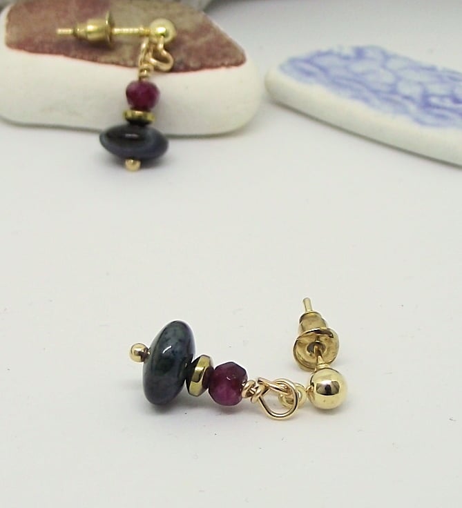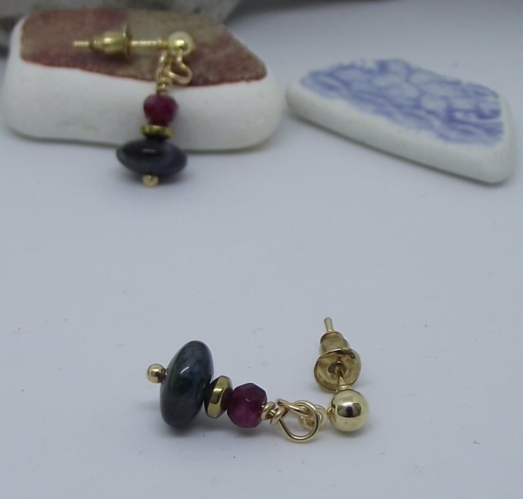 Dark blue grey green agate, deep red jade and gold haematite stud earrings. Gold plate stud ear post, jump ring and wire wrap bead post. Earring drop 25mm
