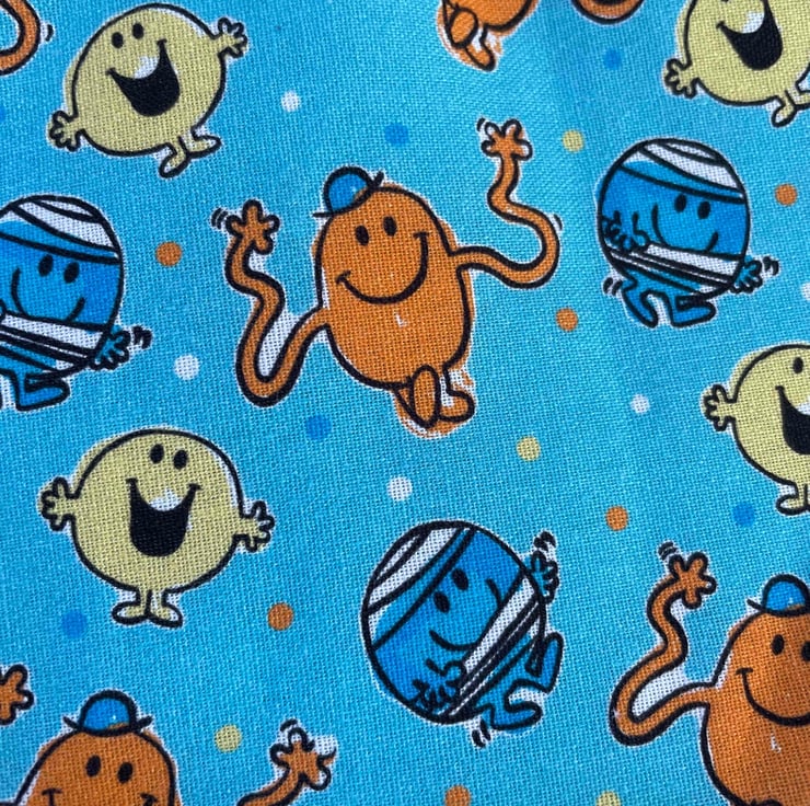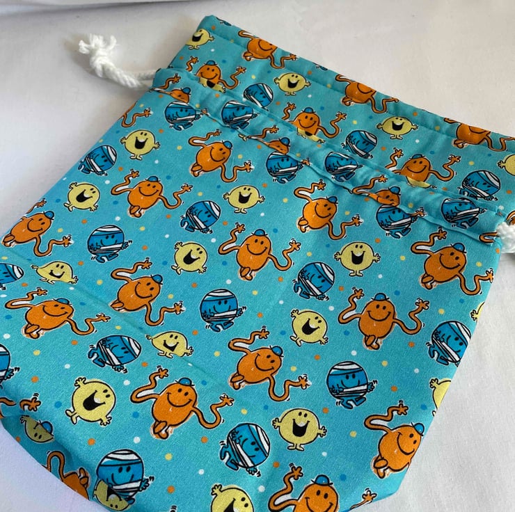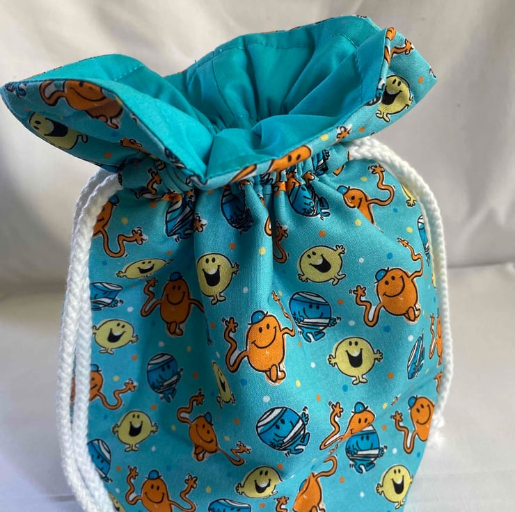Handmade drawstring wash bag/make up bag in a lovely Mr Men fabric design. This can be used for anything as it’s quite versatile. It is fully lined and padded and has a boxed bottom so will stand alone
