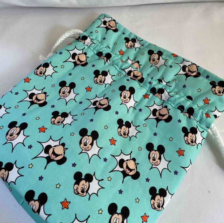 Handmade drawstring wash bag/make up bag in a lovely Disney ‘Mickey’ fabric design. This can be used for anything as it’s quite versatile. It is fully lined and padded and has a boxed bottom so will stand alone
