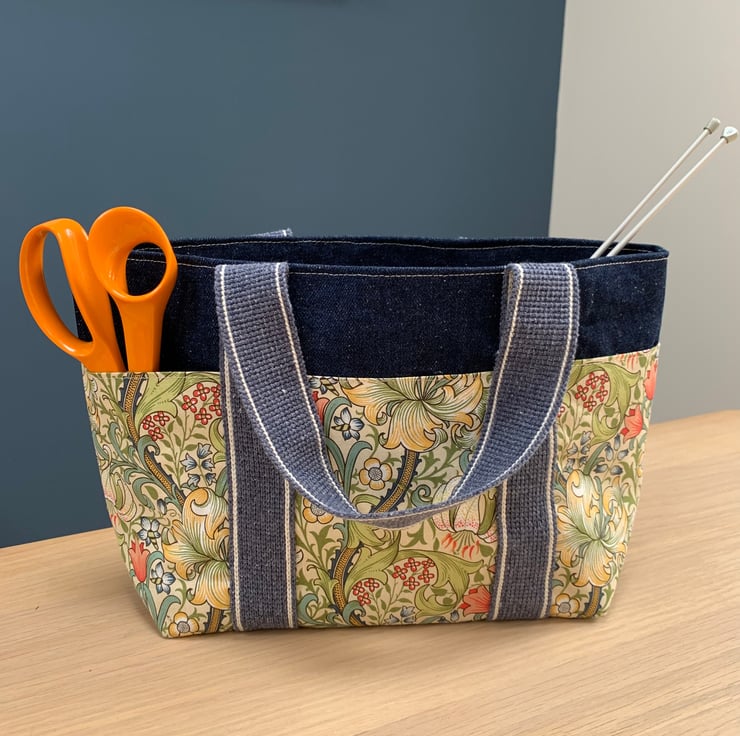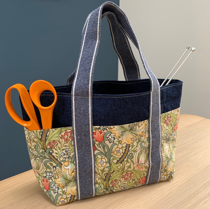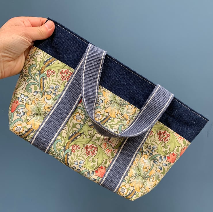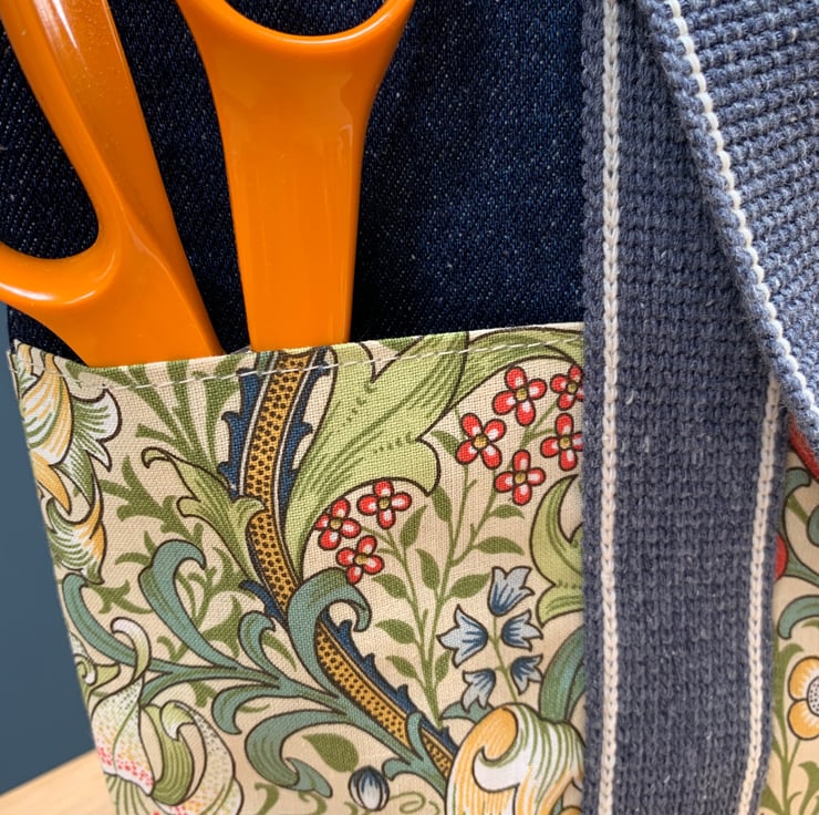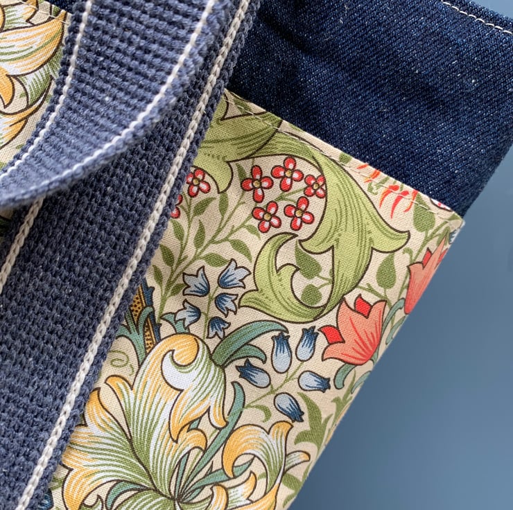 Handy small bag with pockets all round made from dark denim and William Morris Golden Lily cotton with blue webbing straps.