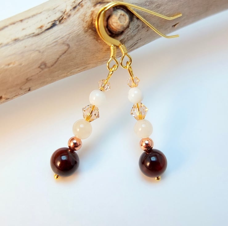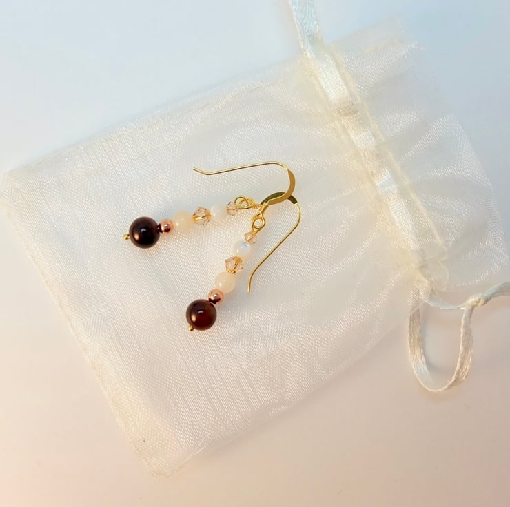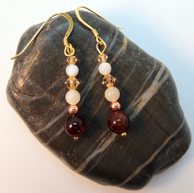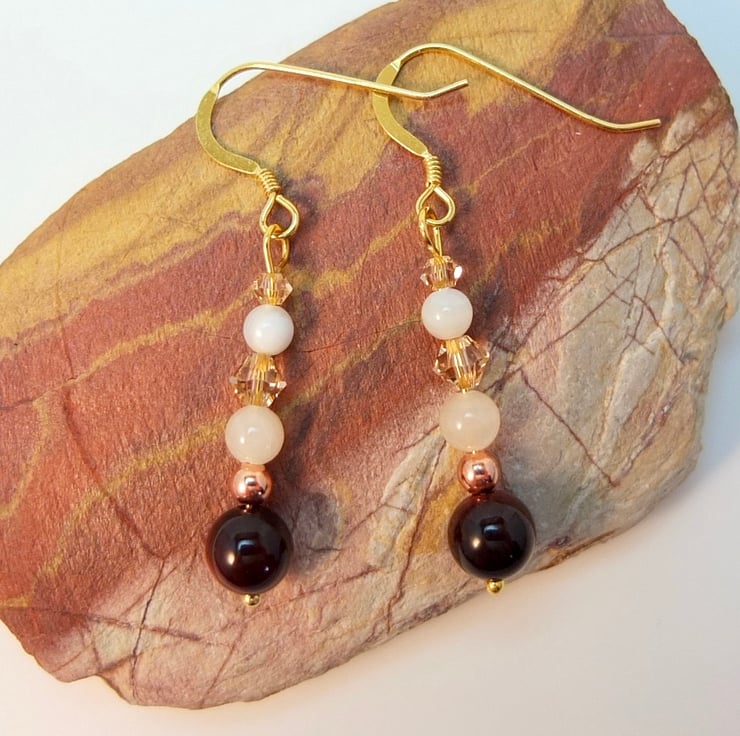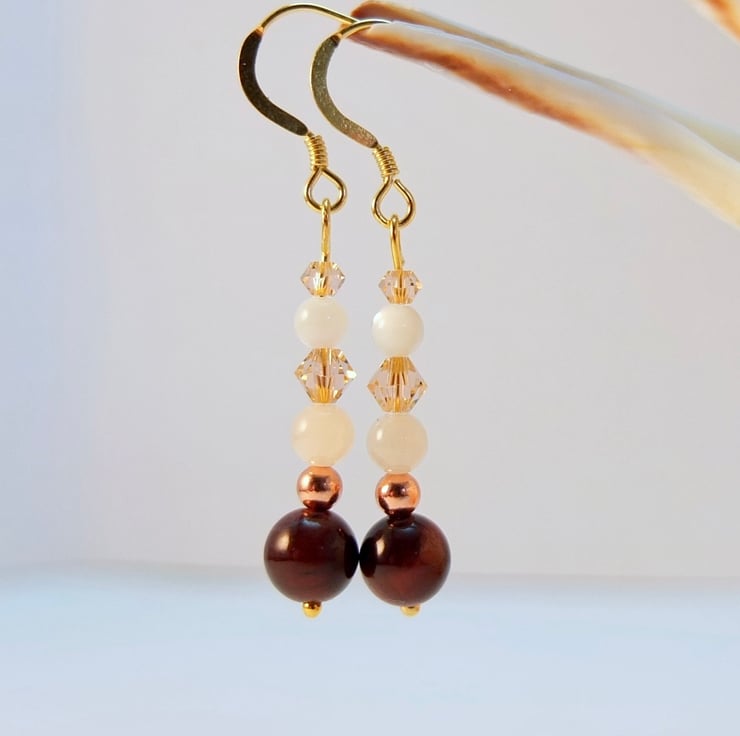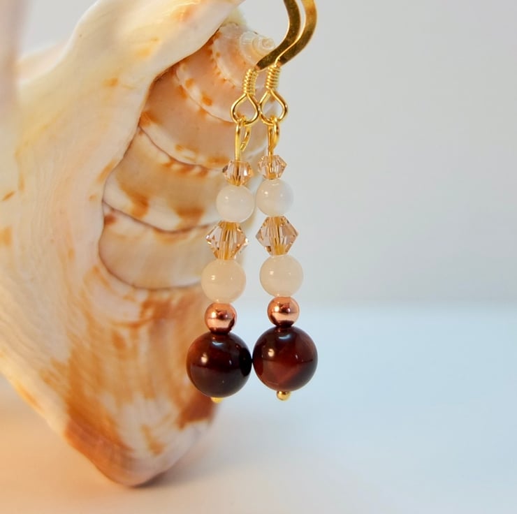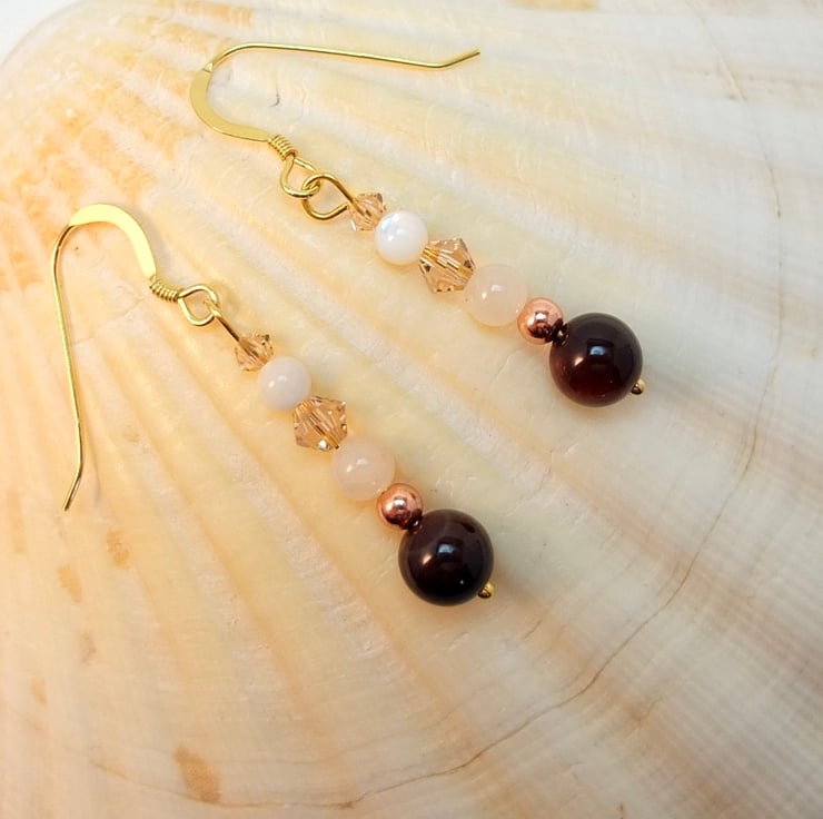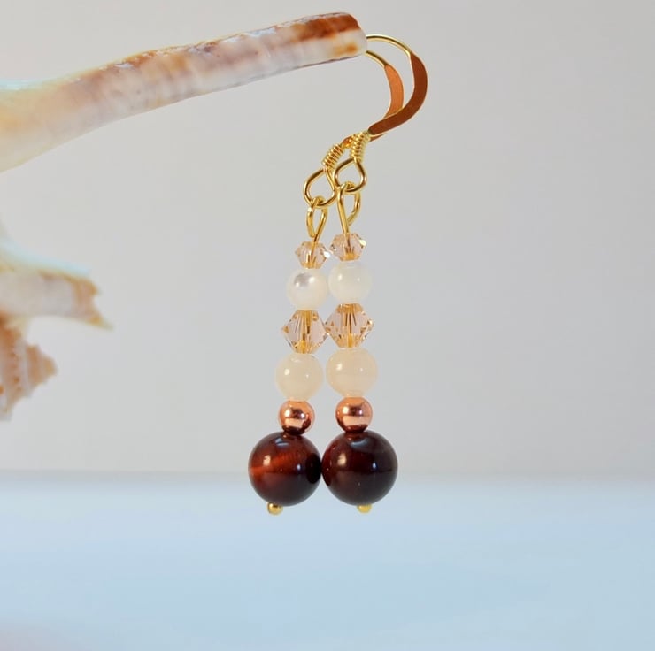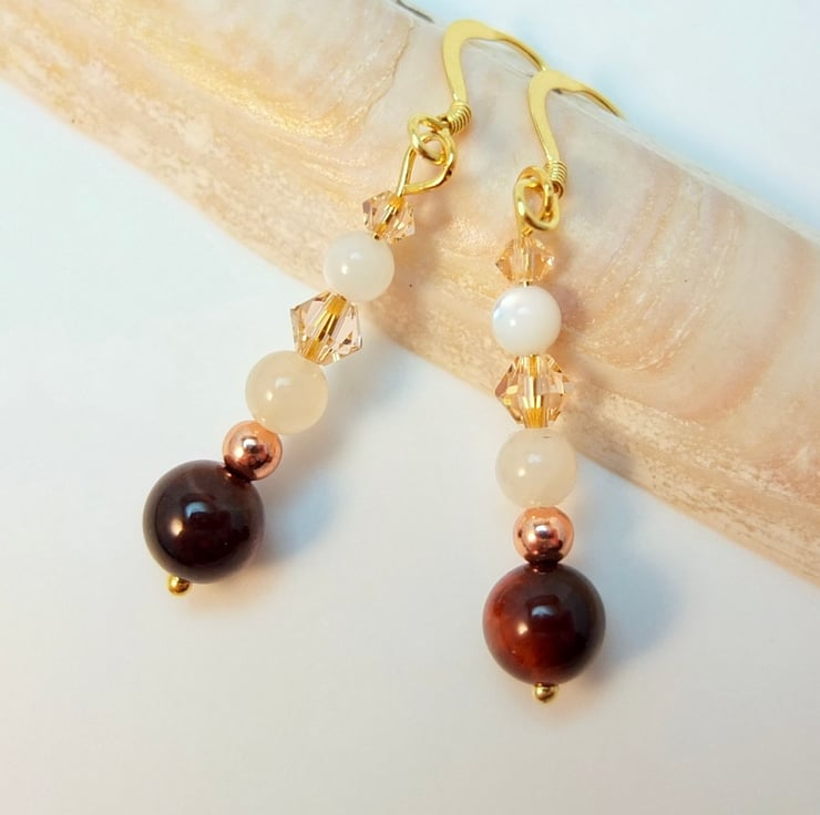 A 6mm red Tigers Eye bead is topped with 3mm copper, 4mm pale peach Mashan Jade, 4mm Swarovski "light peach", 3.5mm mother-of-pearl and 3mm Swarovski "light peach" beads.