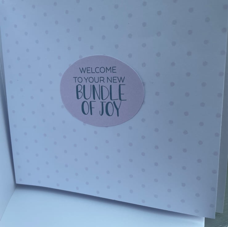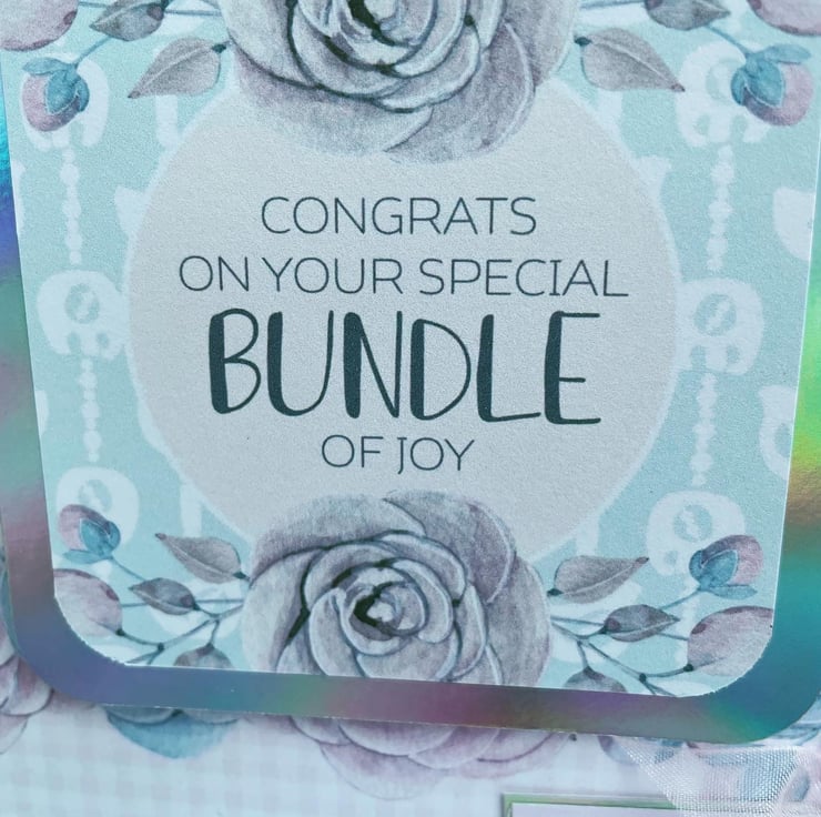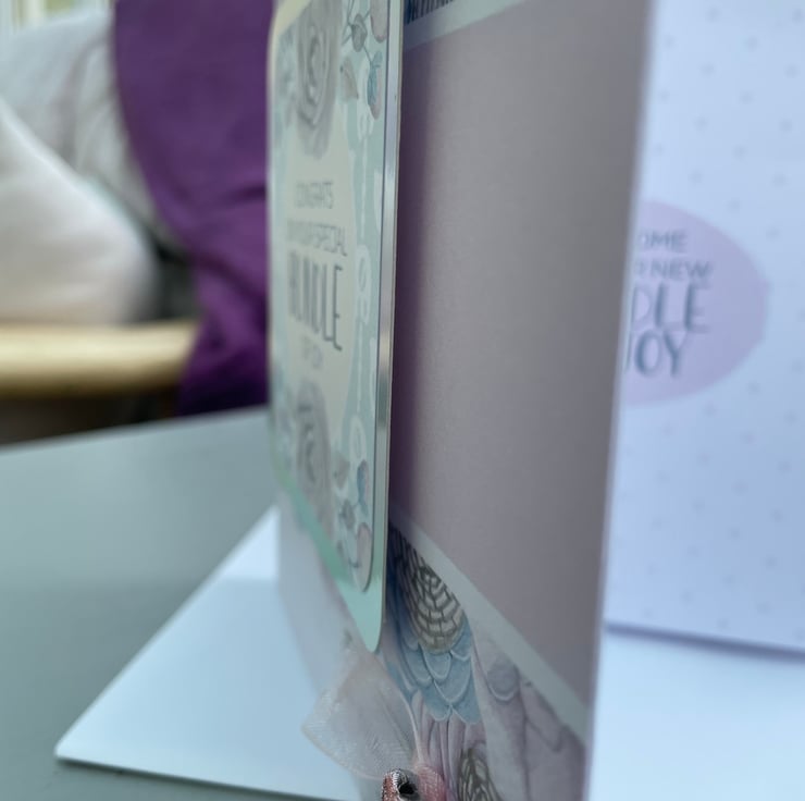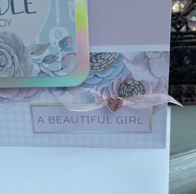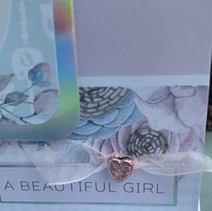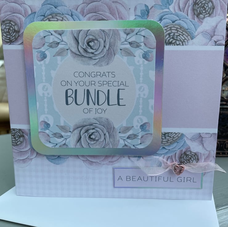 A beautiful and delicate new baby girl card. This 15x15cm card is for a special baby girl birth. The card features a delicate pink and blue backing paper with soft roses the main element.This is topped woth a matching topper with roses. the greeting says Congrats on your special bundle of joy. This is backed with silver rainbow mirror card and this compliments the colours of the card. The second greeting says A beautiful girl, also backed with rainbow mirror card. There is a knotted pale pink organza ribbon on top of this greeting with a pale pink shiny heart bead to finish the design. Inside the card has a matching insert with the palest pink olka dots. The greeting says Welcome to your new bundle of joy.