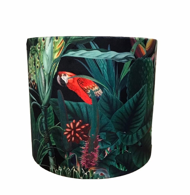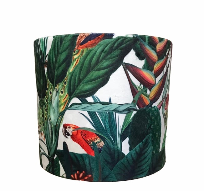 Tropical jungle lampshades made using beautiful soft velvet fabrics, available in 3 background colours, black, navy and white, and in various sizes.