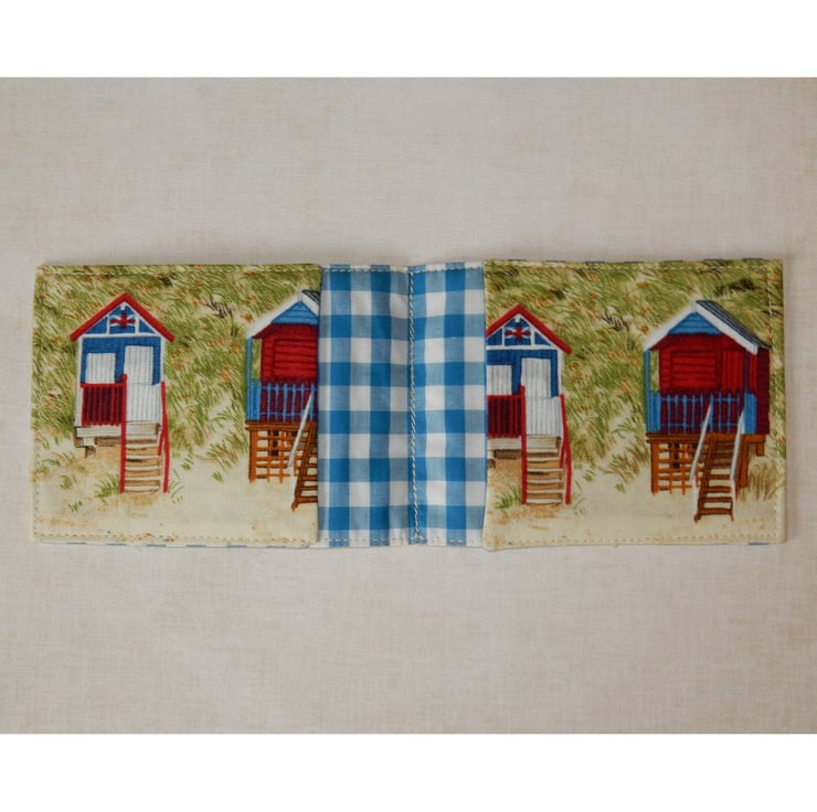 This card wallet would make a great small gift. It features traditional beach huts on the sand dunes, with steps up to reach them. The wallet is ideal for travel cards, Oyster cards, bus pass, train tickets and credit cards. It measures approx. 3.5 x 3 inches folded and 7.5 inches open. It is made from cotton fabric, and lined in a toning gingham fabric.