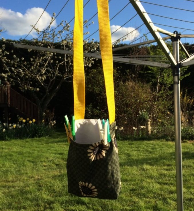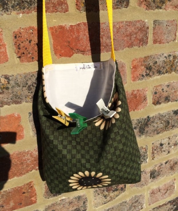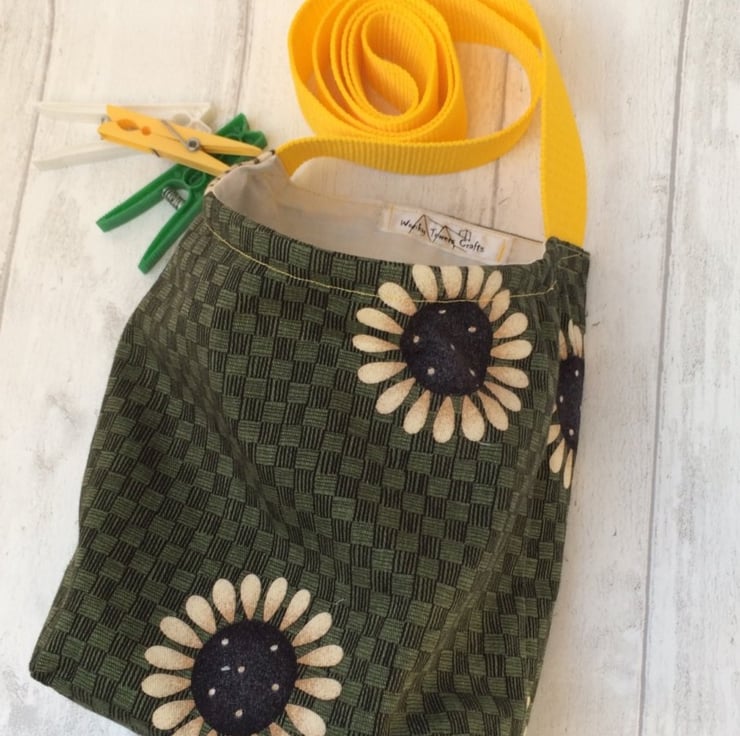 Are you looking for a peg bag with a difference? This one is made from a lovely green and yellow, brushed cotton fabric and has a bright yellow strap. Our peg bags are designed to be worn over your shoulder so that your pegs are always at your fingertips as you hang out the laundry. There is a short length of lightweight boning inserted in the front of the bag to avoid it sagging, meaning that accessing pegs is easy and fumble-free. This bag has a plain white lining, measures approximately 22 x 26cm and will hold at least 50 clothes pegs. The strong, webbing strap, measures approx. 120cm.