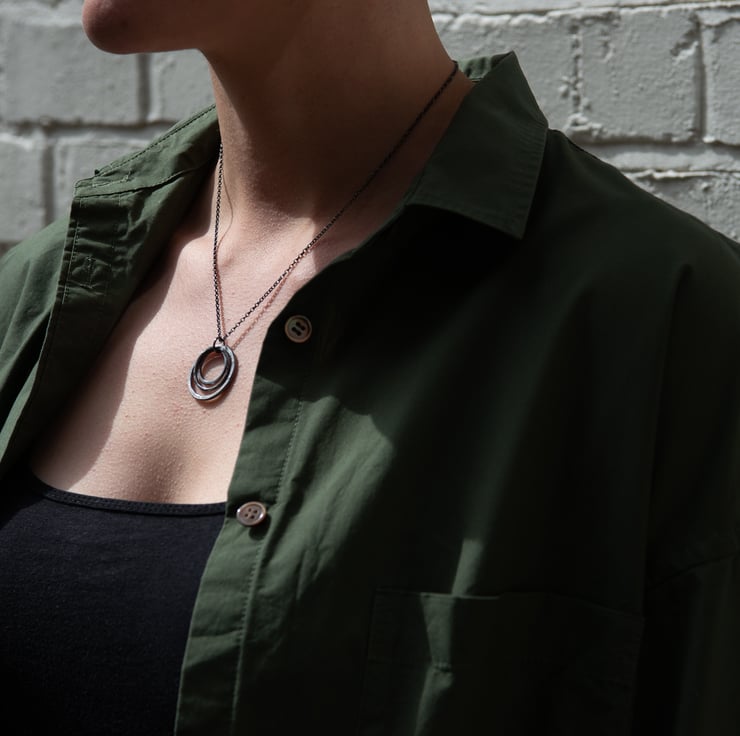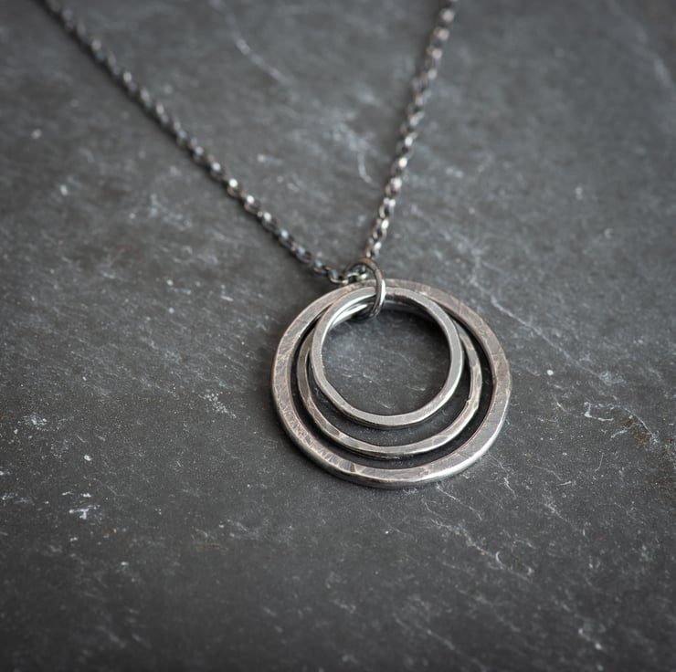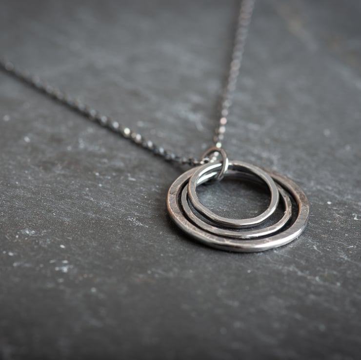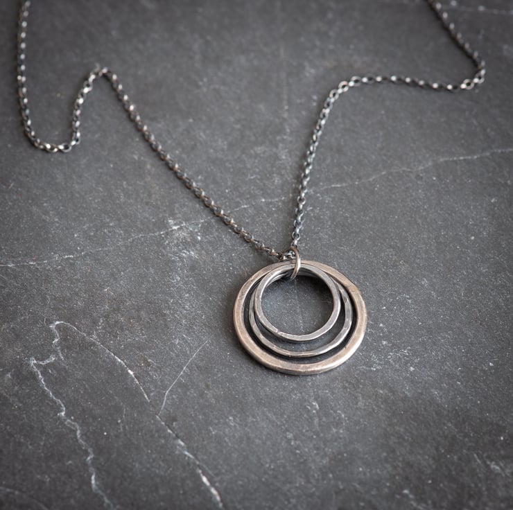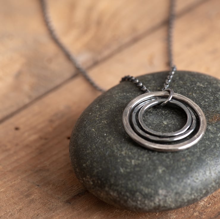 I have hand formed, soldered and hammered each circle individually, and then given them a dark oxidised finish. The finish has been polished away slightly to highlight the textures.