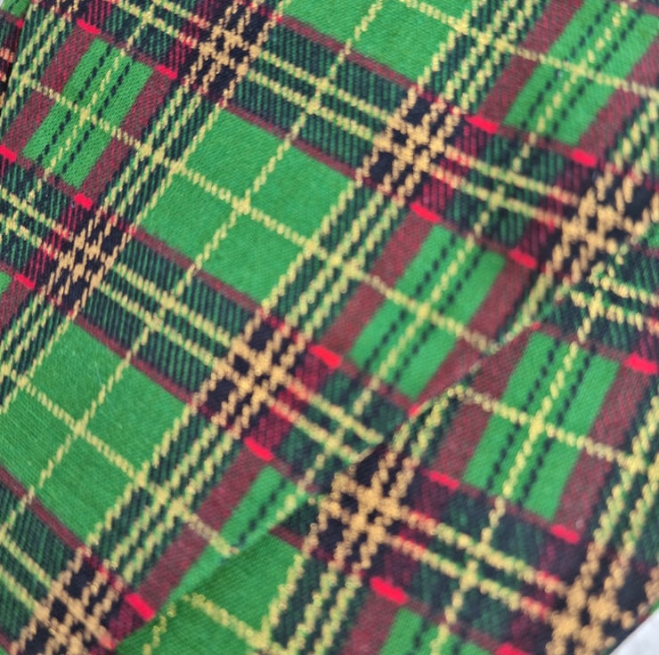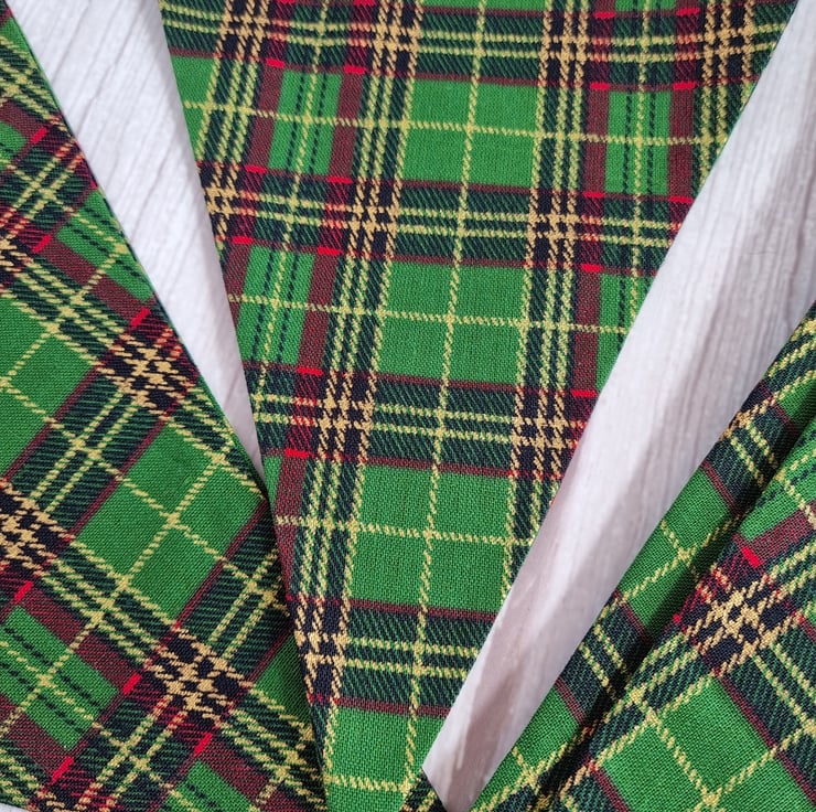 Green tartan bunting with matching green bias binding. The fabric has gold coloured threads running through it.