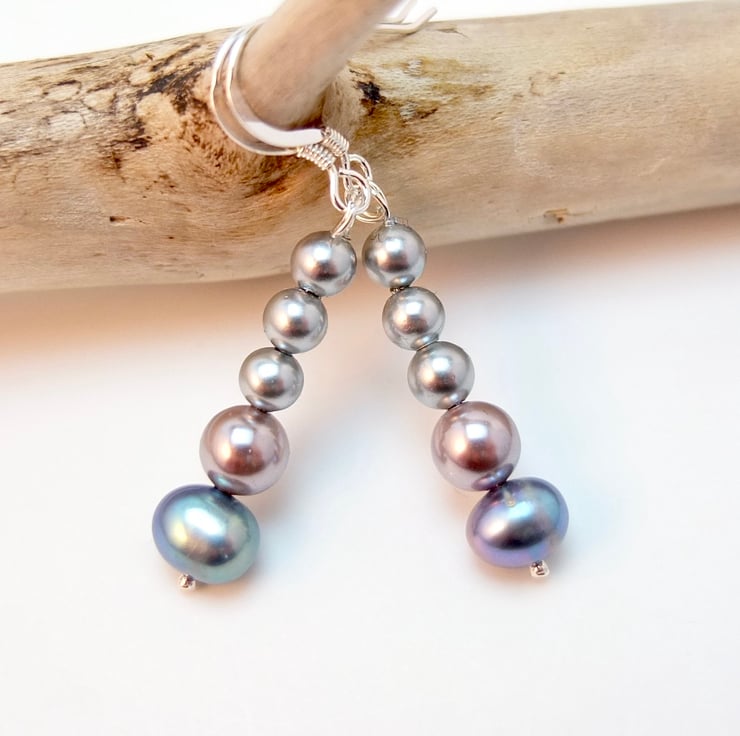 Above it I have strung a single 6mm, pale lavender, and a trio of 4mm silver-grey, shell pearls.