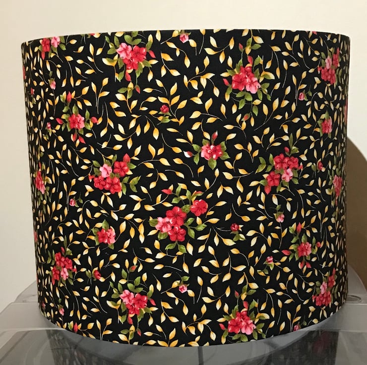 Floral spring flower lampshades made using beautiful colourful fabrics, available in 3 designs: pink flowers on a black background, pink & yellow wildflowers on a black background, and pink and yellow wildflowers on a white background, and in various sizes.